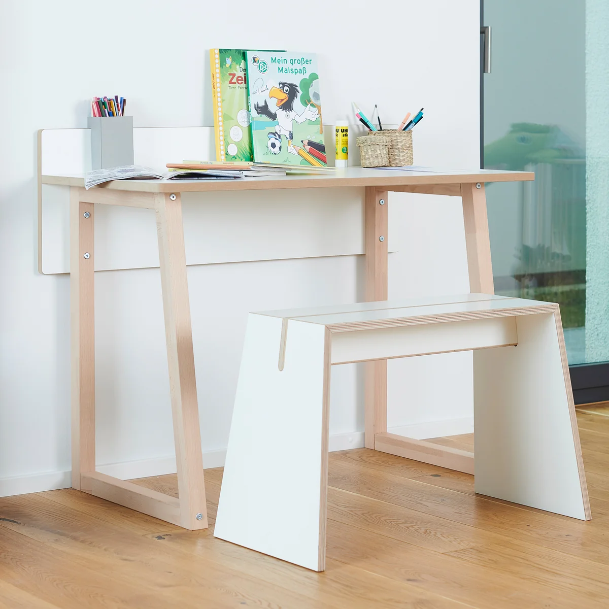 Der werk Kinder-Schreibtisch wird aus beschichteten MDF-Platten und naturbelassener Buche gefertigt.