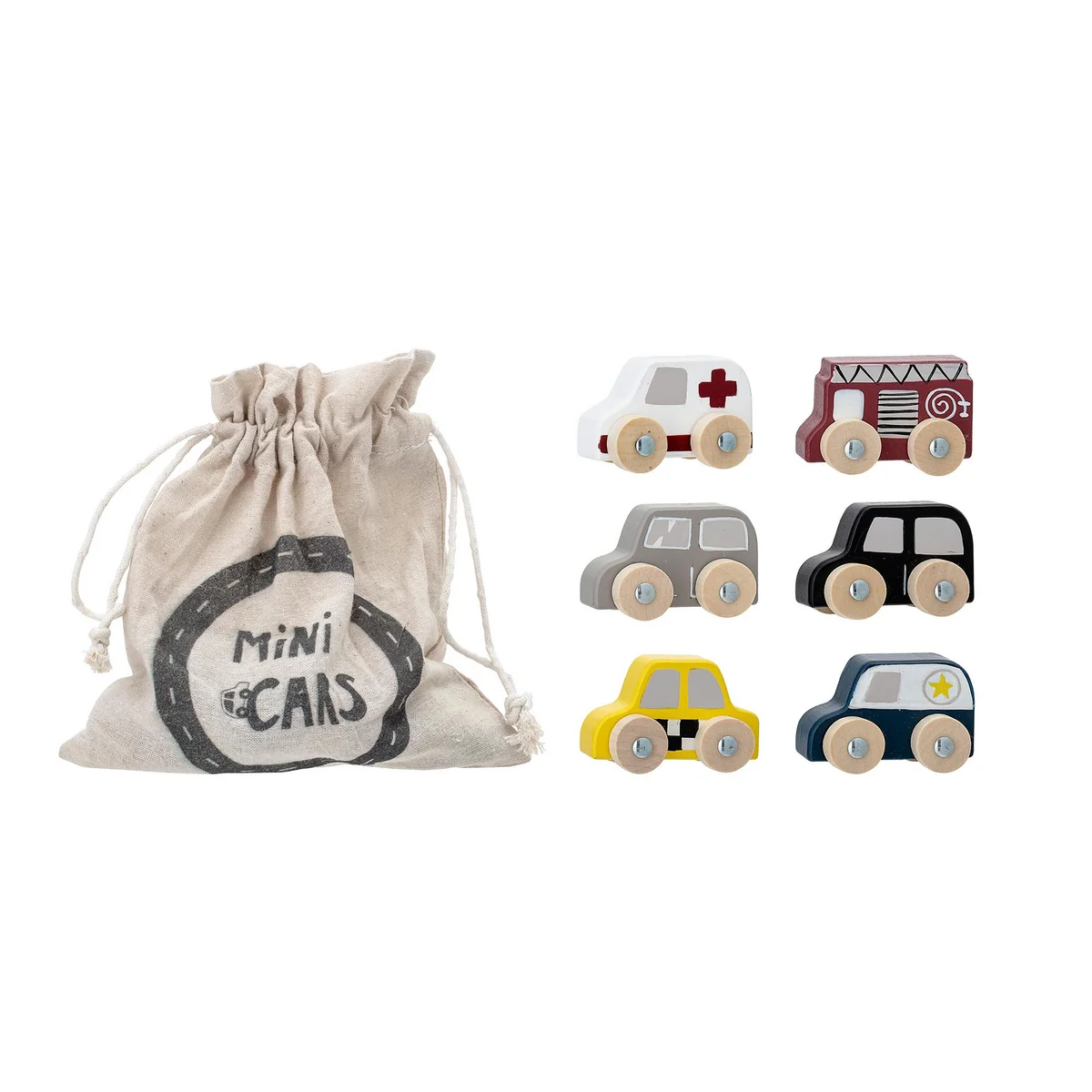 Mit den Holzfahrzeugen von Bloomingville lassen sich Abenteuer im Kinderzimmer erleben. Das Set besteht aus sechs verschiedenen Fahrzeugen mit Rollen inklusive Taxi, Polizeiauto, Krankenwagen und Feuerwehrauto. Mit den Fahrzeugen haben groß und klein besonders viel Freude auf einem Spielteppich mit Straßen.