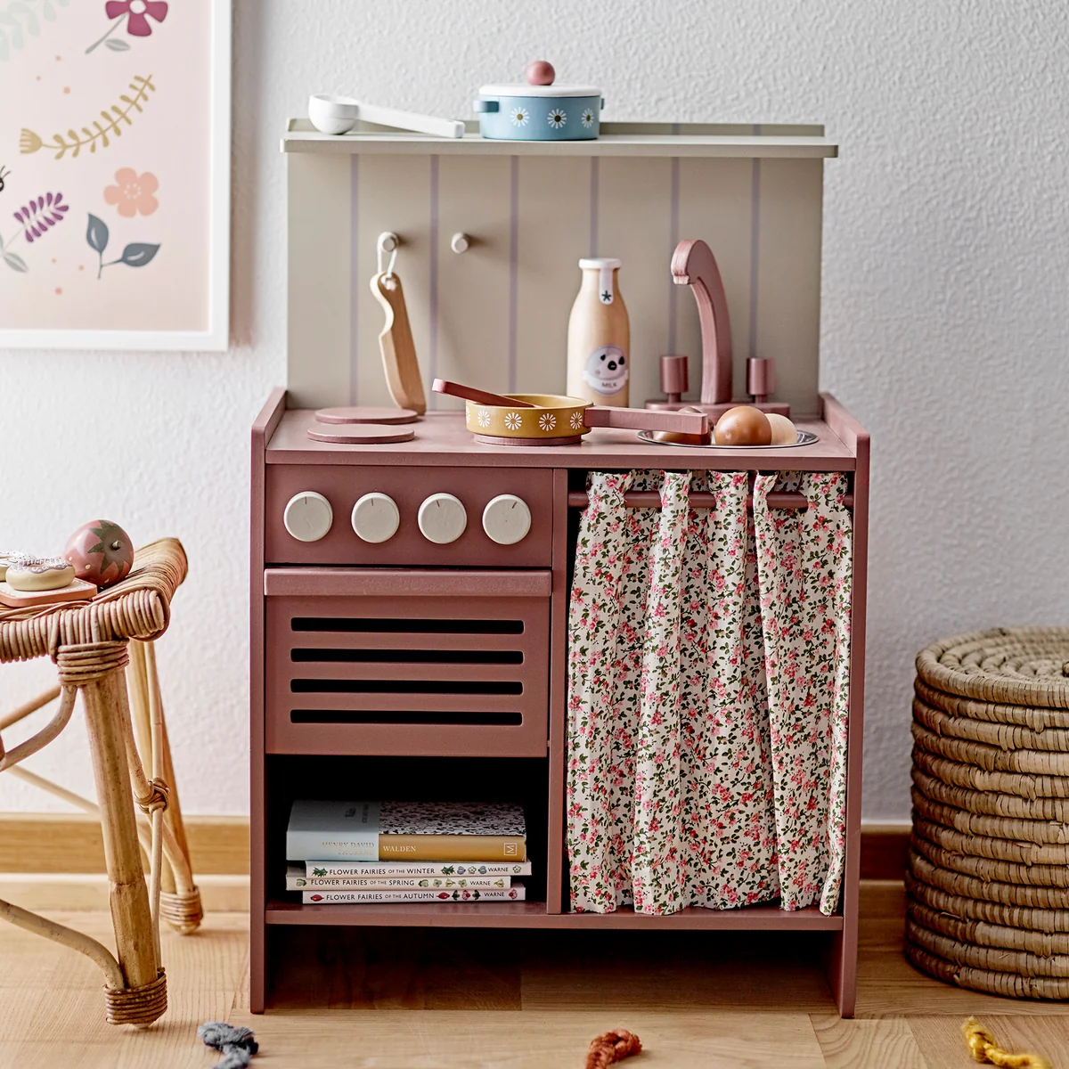 Die Pippi Kinder Spielküche bietet kochbegeisterten Kindern alles, was sie brauchen. Eine kleine Arbeitsplatte, Wasserhahn und Spülbecken. Sogar vier Kochplatten sind drauf angebracht, selbstverständlich ungefährlich für Kinder. Die Küche aus Lotusholz verfügt außerdem über einen Ofen und eine Küchenrückwand, an der man kleine Trockentücher aufhängen kann.