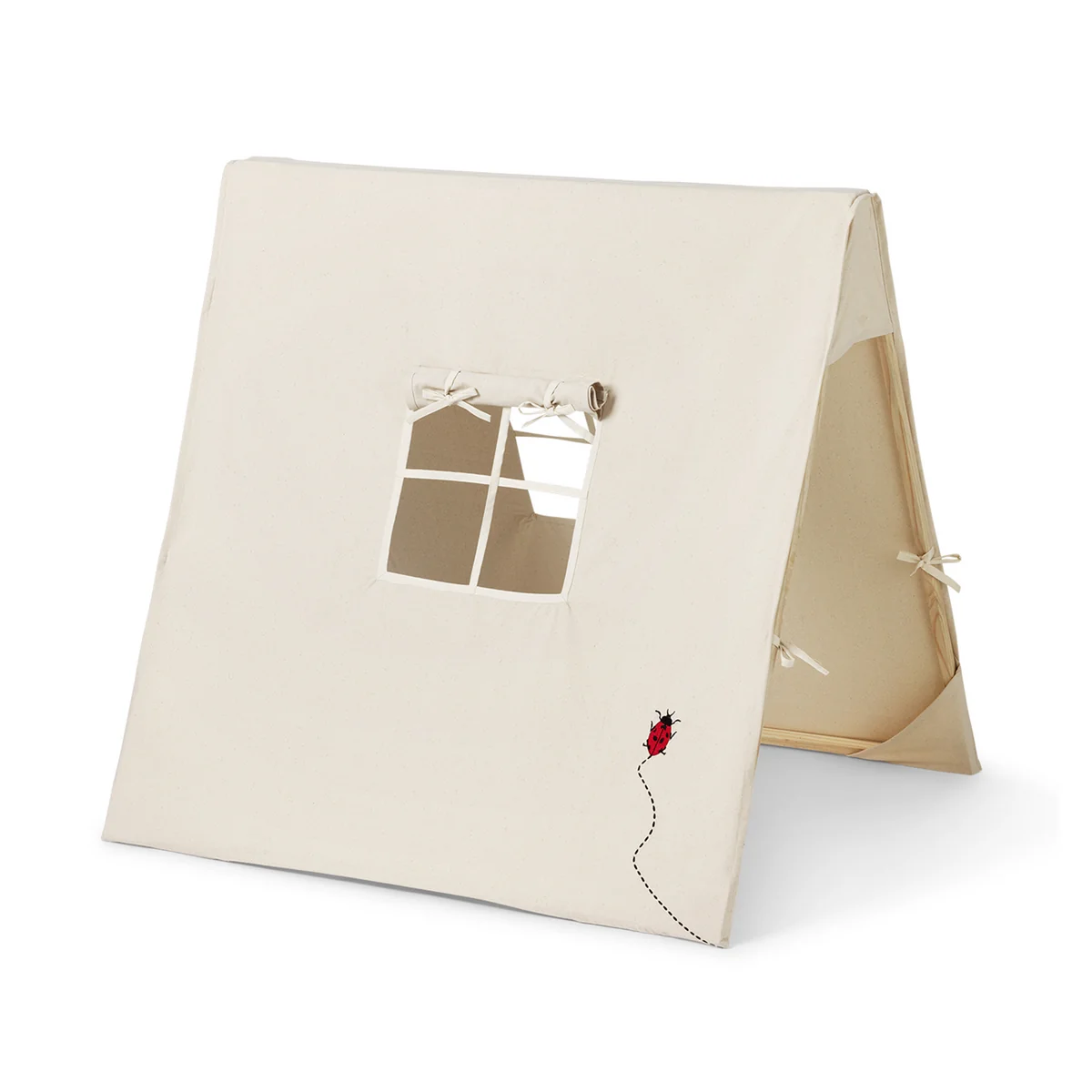 Farblich fein abgesetzte Details, wie die beiden Sprossenfenster, die durch Rollos geöffnet und geschlossen werden können, machen das Zelt zu einem tollen kindlichen Begleiter. Die verstärkten Ecken und Bänder sorgen wiederum dafür, dass der Baumwollstoff an dem Rahmen nicht verrutschen kann.