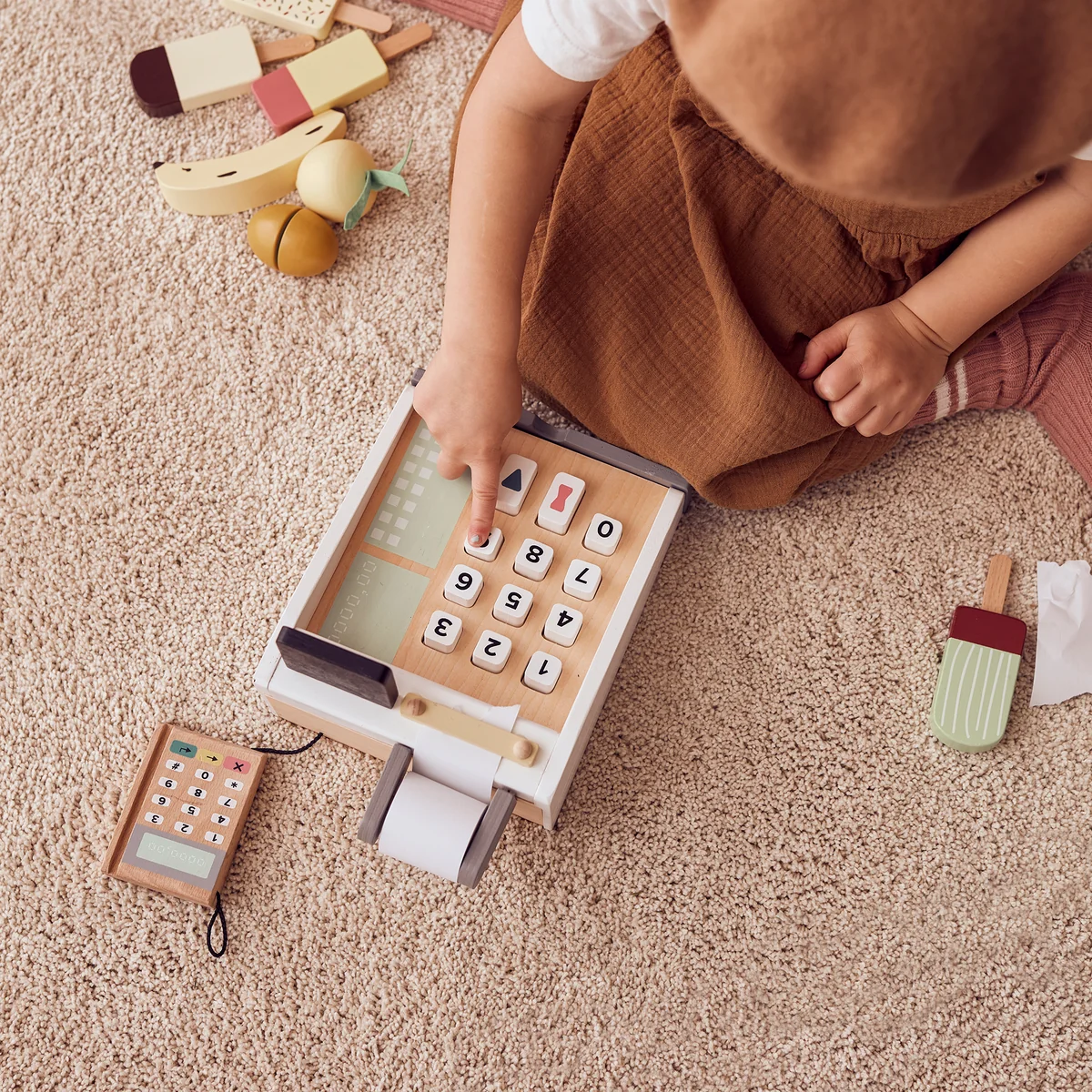 Die Bistro Spielzeug-Registrierkasse von Kids Concept eignet sich ideal für kleine Kioske oder Geschäfte. Diese Registrierkasse verfügt über drückbare Tasten, eine Preistafel zum Schreiben und wird komplett mit weißer Kreide, Fächern für Geldscheine und Münzen sowie einem Kartenleser mit zwei Karten geliefert.
