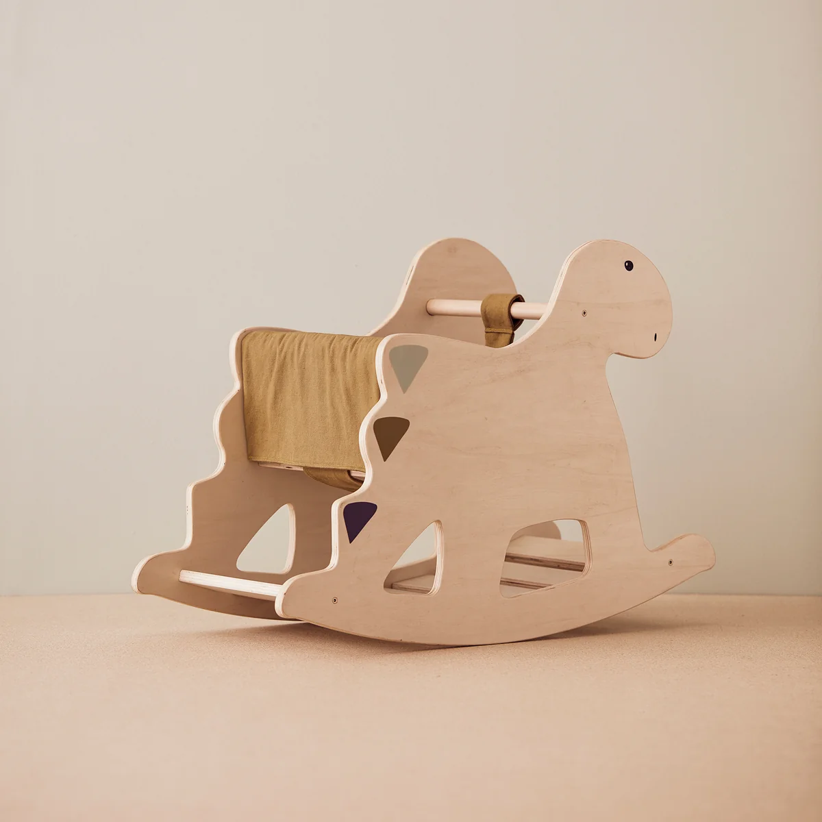 Dieses Schaukelpferd ist aus hochwertigem Holz gefertigt und liebevoll designt, um die Aufmerksamkeit der Kinder zu erregen. Anstelle eines traditionellen Pferdes verfügt dieses Schaukelpferd über eine Dino-Figur.