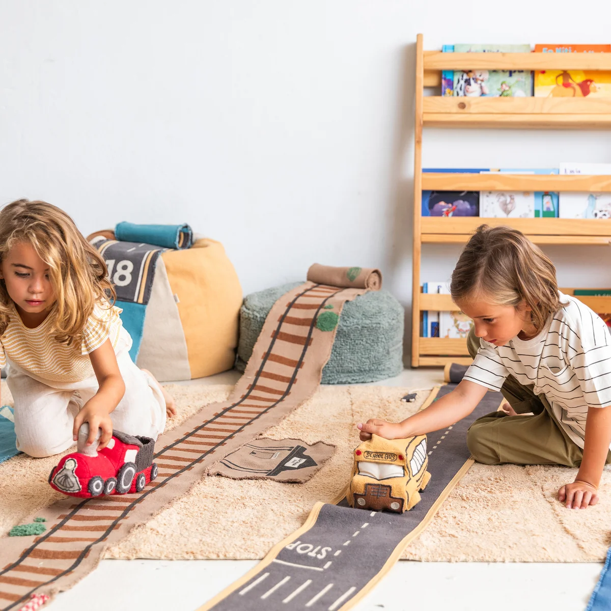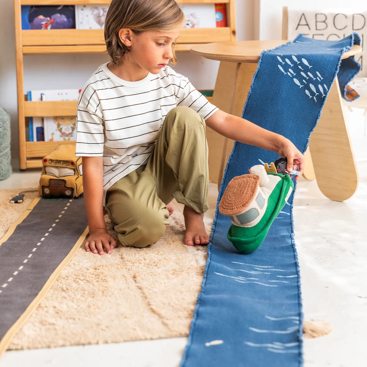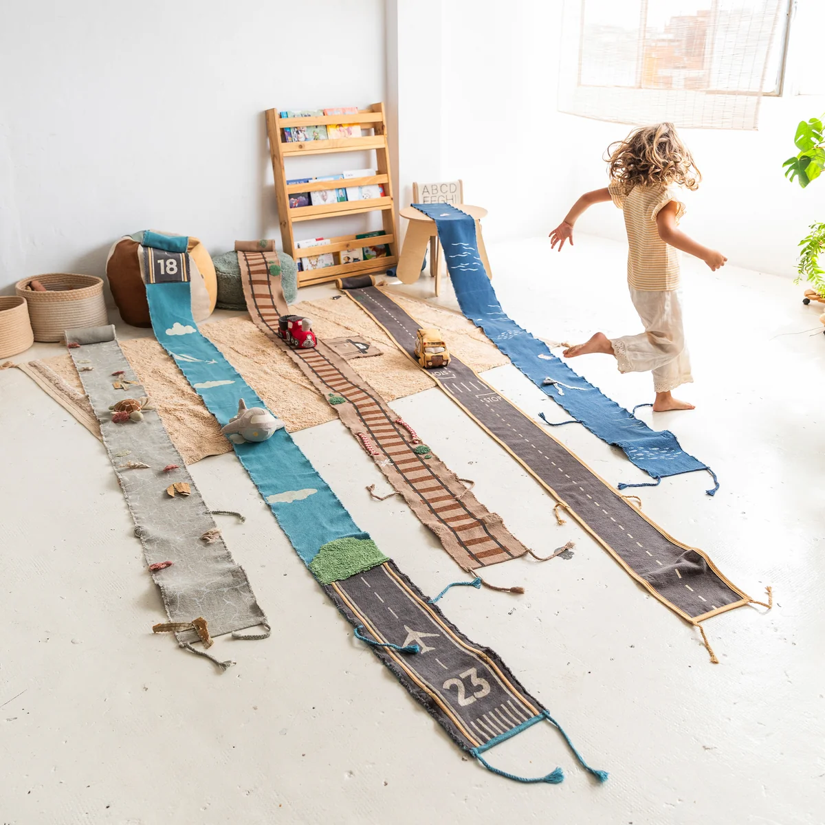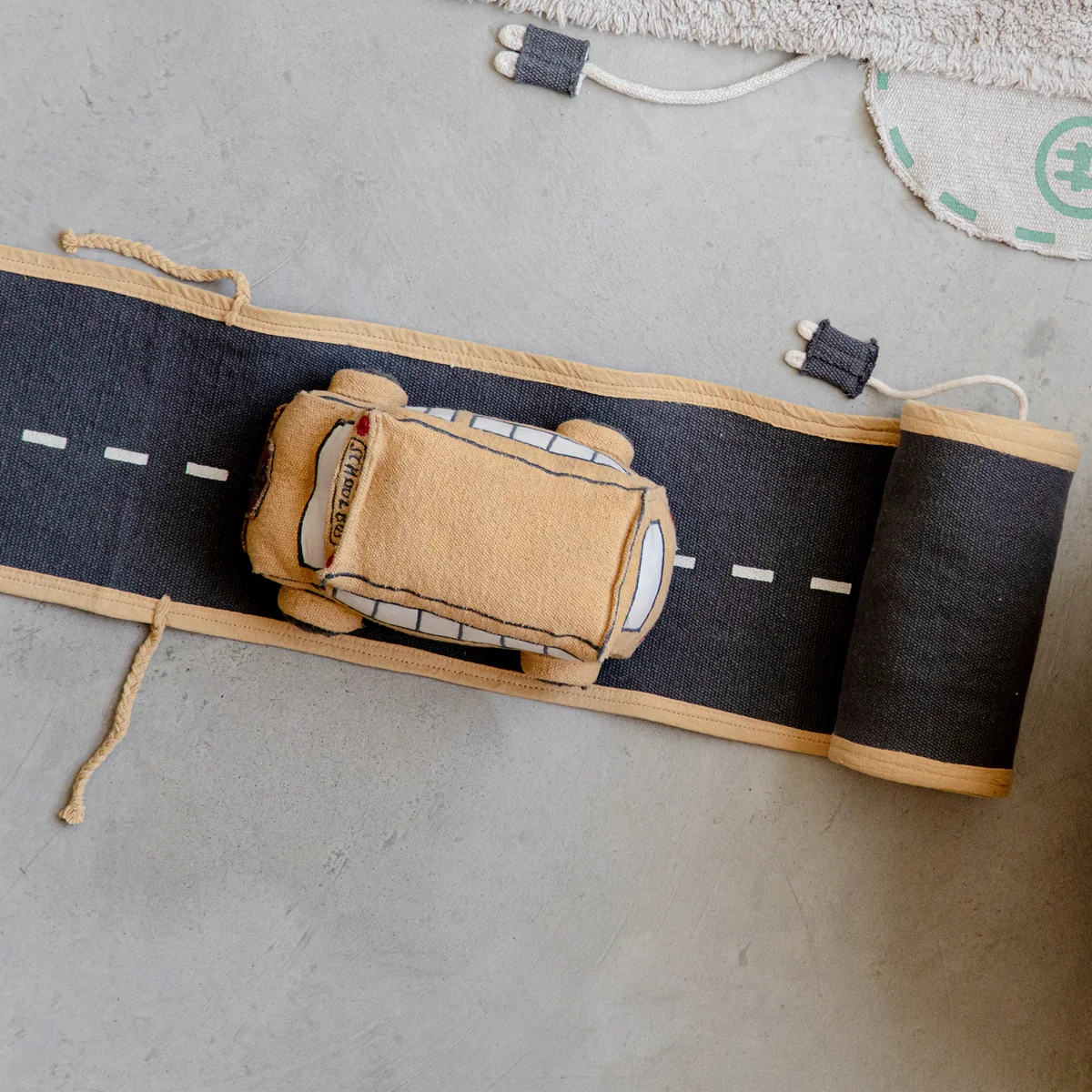 Das Ride & Roll Spielset des Herstellers Lorena Canals bietet eine Menge Fahrspaß! Das Set ermöglicht, dass Kinder den langen Planenweg überall ausrollen und mit dem Stoffbus diesen befahren können. Die Baumwollplane ist vier Meter lang und wird aus Baumwolle und Polyester gefertigt.