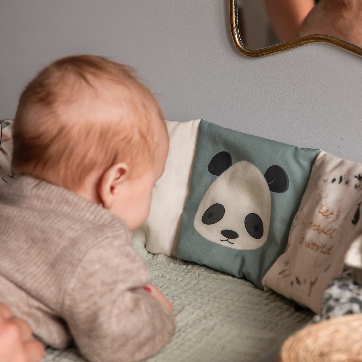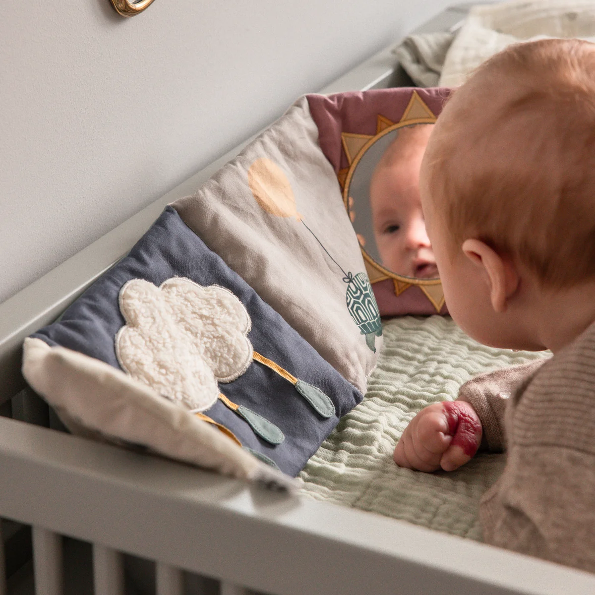 Somit lernt das Kind, zwischen unterschiedlichen Oberflächen zu unterscheiden. Mit einem Spiegel ausgestattet, lernt das Kind zusätzlich sein eigenes Gesicht kennen und kann sich sein eigenes Mienenspiel beobachten. Der Beißring hinten im Buch verleiht dem Aktivitätsbuch eine praktische Note, sodass es das perfekte Tool für unterwegs ist.