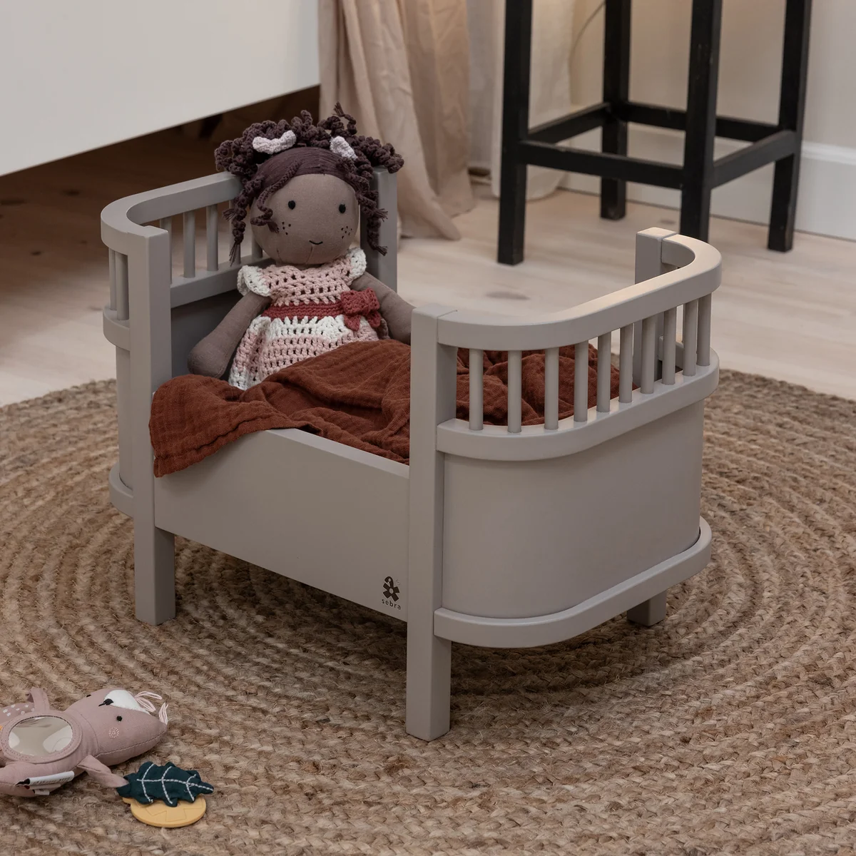 Das Puppenbett von Sebra ist eine Miniatur-Version des ikonischen Betts von Sebra, wobei sich die Dimensionen des Puppenbettes an dem Baby Bett von Sebra orientieren, wo es noch nicht ausgezogen ist, aber die Gitterseiten bereits entfernt sind. Das Stadium also in welches das Kind bereits groß genug ist, um allein aus seinem Bett auf den Boden zu klettern, um mit dem Puppenbett, Puppen und Teddybären zu spielen.