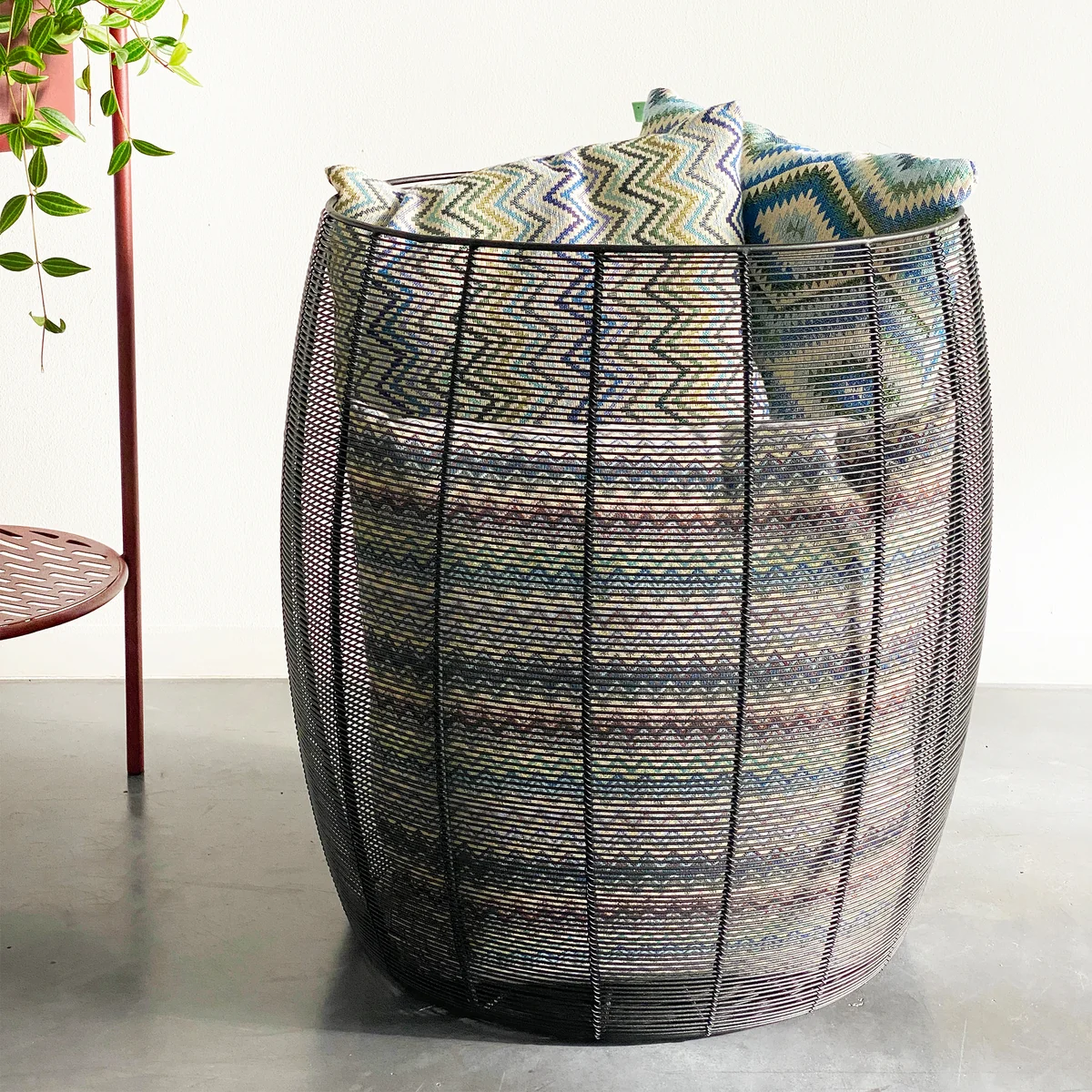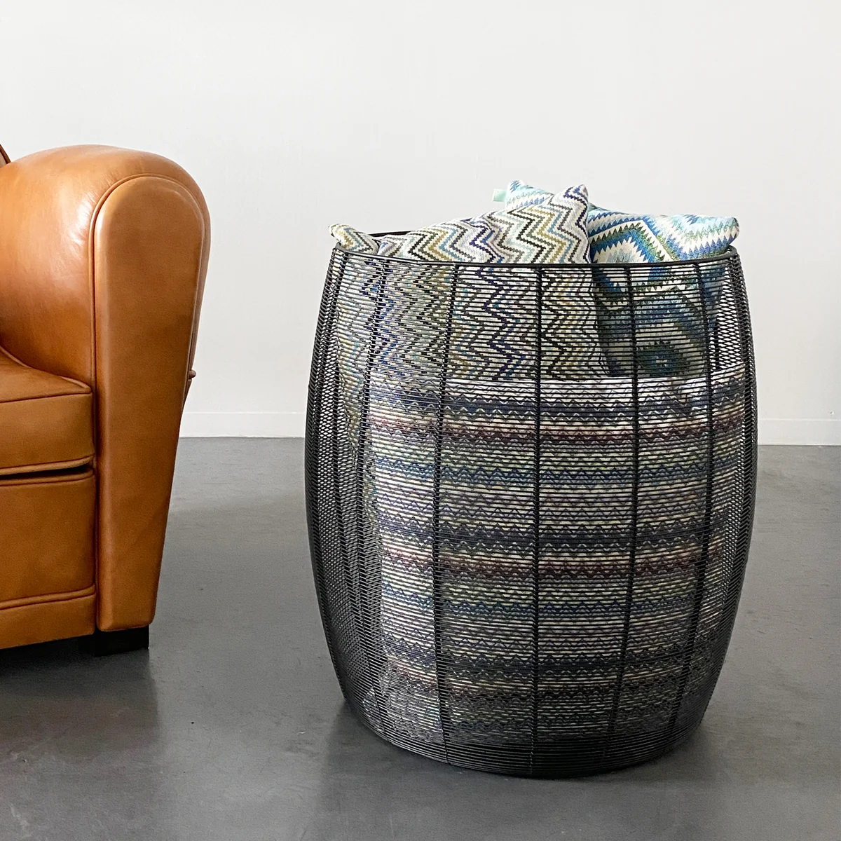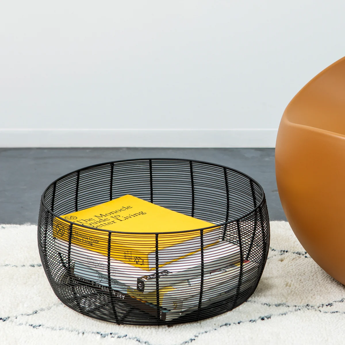 Der Dora Basket von XLBoom ist ein Aufbewahrungskorb aus Metall, der formschön alltägliche Gegenstände wie Zeitschriften oder Schals an einem Ort sammelt.