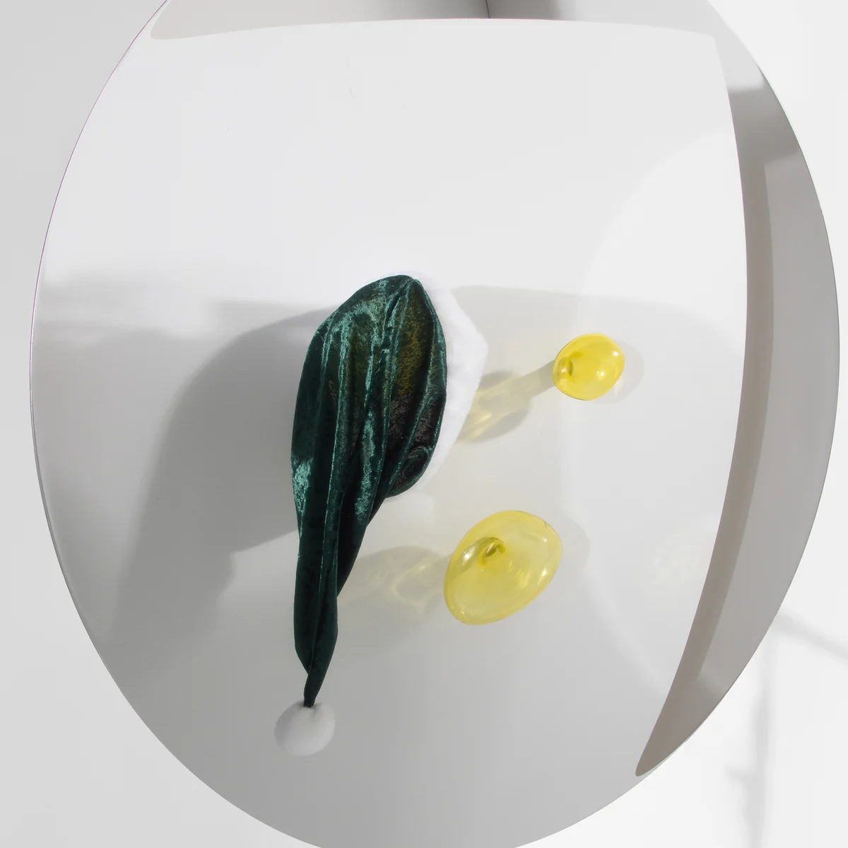 Der einzige Kontakt zur Wand ist die Befestigung, die die eingefrorenen Seifenblasen sicher an der Wand hält. Zusammen mit dem Glas schafft der Haken eine Illusion von Zerbrechlichkeit bei gleichzeitiger Stabilität.