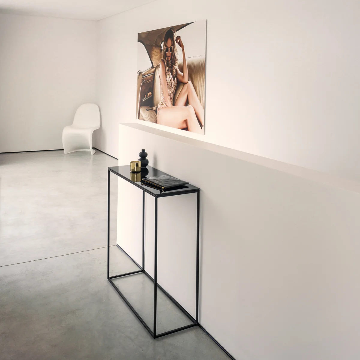 Der Beistelltisch besteht aus einem Gestell aus pulverbeschichtetem Stahl. Auf dem Gestell liegt eine passgenaue Glasplatte, die dem Tisch eine filigrane und transparente Optik verleiht. Zudem überzeugt der Rack Konsolentisch mit seiner schmalen Form. So passt er auch in etwas engere Flure ohne dabei zu viel Raum einzunehmen.