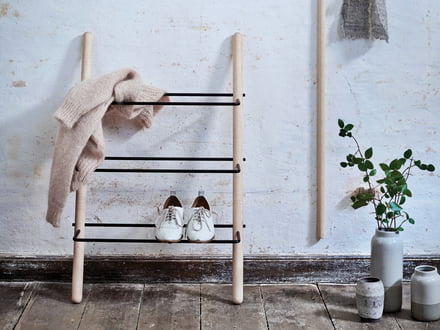 Freistehende Schuhablagen bieten oft noch weitere Nutzungsmöglichkeiten, wie Sitz- und Ablagemöglichkeiten oder dienen der Kleideraufhängung.