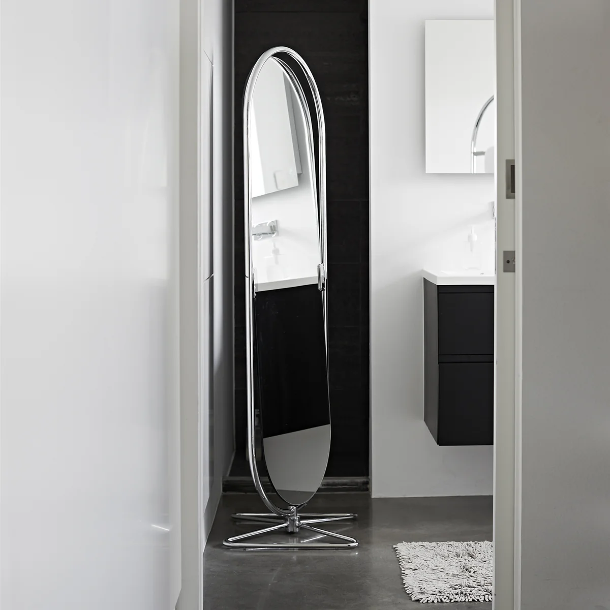 Bei dem System 1-2-3 Spiegel von Verpan handelt es sich um einen Entwurf des dänischen Erfolgsdesigners Verner Panton, der für seine extravaganten Designs bekannt ist. Der elegante Spiegel zeichnet sich durch seine ovale Form aus, die von einem glänzend verchromten Rahmen aus Stahlrohr gefasst wird.