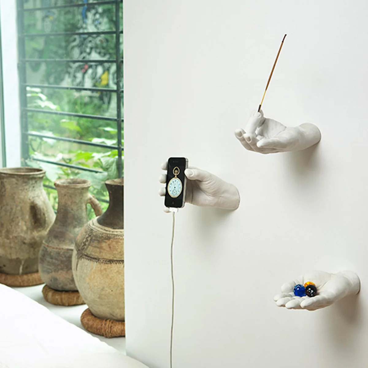 Hand Hooks von Areaware sind verschiedene Wandhaken und Wandhalter in Form von Händen. Die erfolgreiche Hand Hooks Serie bietet zahlreiche Varianten: Ob für Räucherstäbchen zwischen Daumen und Zeigefinger, mit offener Handfläche zur Ablage von Schlüsseln, Wechselgeld oder Seife, mit angewinkeltem Zeigefinger als Garderobenhaken, mit Zylinderblumenvase in der Hand oder die greifende Hand als kreative Halterung für die Technik von heute. Statt schnöder Funktionalität erfreuen die Hand Hooks das Auge des Betrachters mit charmantem Design, das zum Hingucken einlädt.