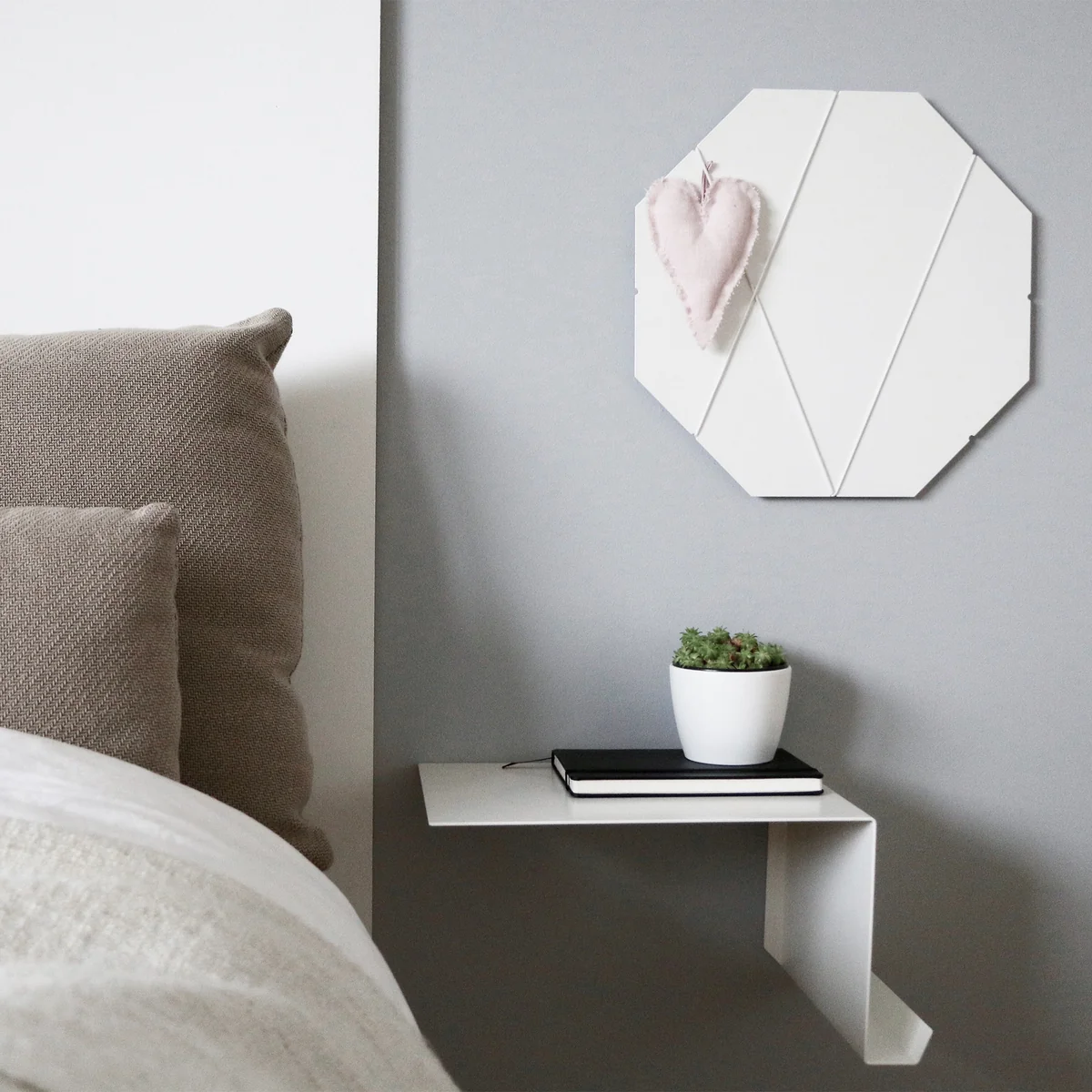 Das Bedside Table von Nichba Design ist ein multifunktionales, schlichtes und zeitloses Wandregal, welches vielseitig einsetzbar ist. Das Regal verfügt eine seitliche Ablage für Zeitschriften und Magazine und macht sich besonders gut als schwebender Nachttisch neben dem Bett oder als Ablage im Flur, wo Briefe, Schlüssel und andere Dinge abgelegt werden können.