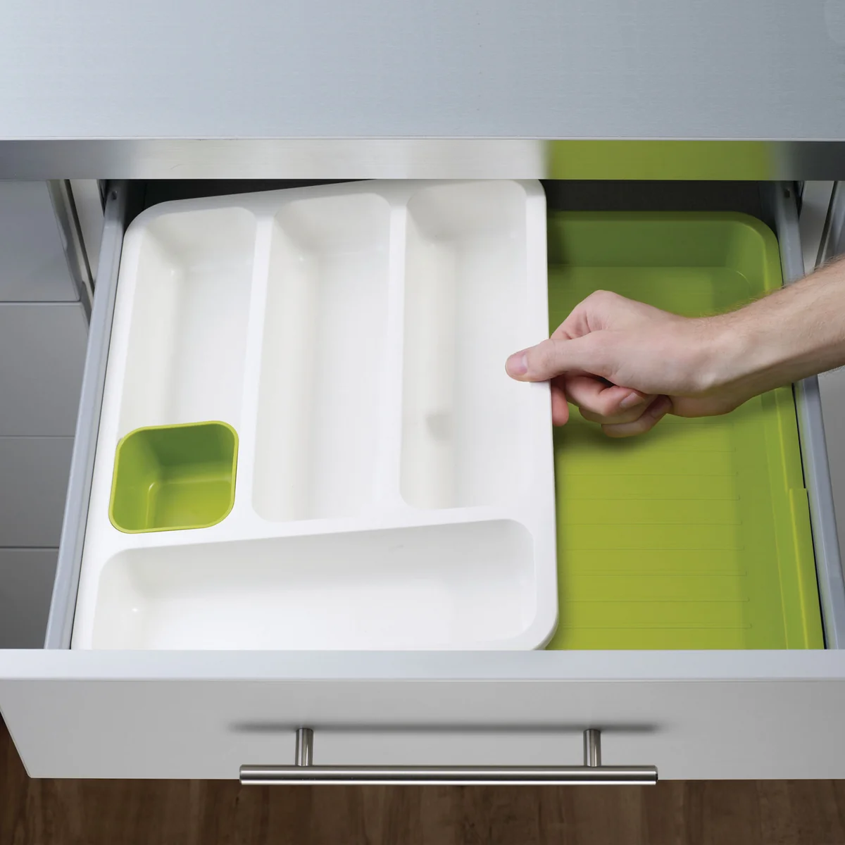 Der DrawerStore Besteckkasten von Joseph Joseph eignet sich besonders für Küchen mit wenig Platz. Seine einzigartige Konstruktion schafft auf kleinstem Raum Platz für Messer, Gabel und Löffel, die in herkömmlichen Besteckkästen mindestens doppelt so viel Platz benötigen würden. Der Trick: Das Besteck wird nicht in nebeneinanderliegenden Fächern verstaut, sondern über- und untereinander.