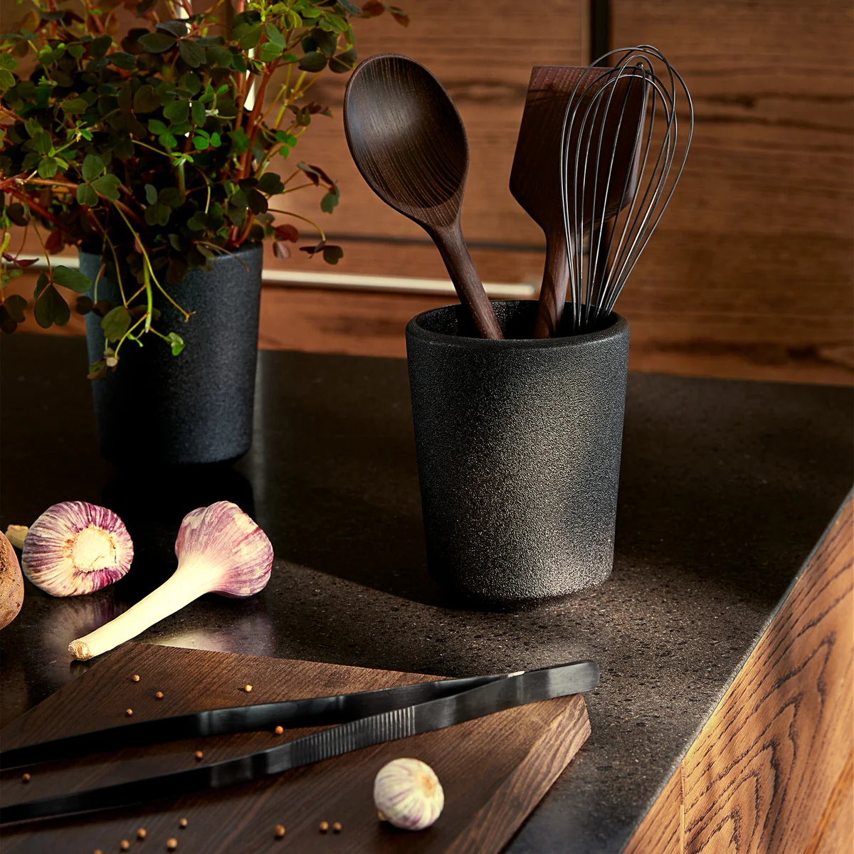 Der RÅ Utensilienbehälter des dänischen Labels Rosendahl ist ein unverzichtbares essenzielles Tool für die Küche. Der Behälter begeistert mit seiner rustikalen Gusseisen-Optik. Er wird aus Steingut gefertigt und kann problemlos in der Spülmaschine gereinigt werden. Je nach Präferenz kann der RÅ Utensilienbehälter mit Küchenwerkzeugen jeglicher Art befüllt werden. Optisch passen jedoch besonders gut die RÅ Küchenhelfer.
