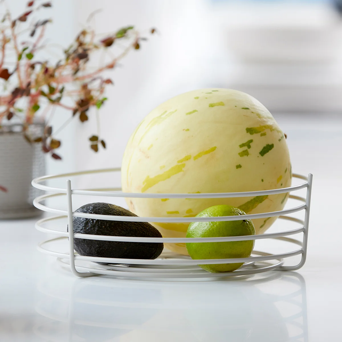 Wird die Baumwolltasche nicht genutzt, so kann der Korb auch als moderne Schale für Obst und Gemüse genutzt werden, die dekorativ auf dem Tisch einen Platz finden kann.