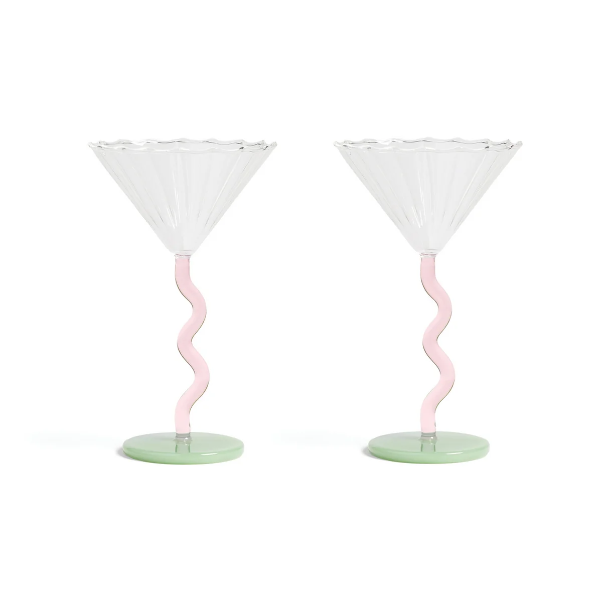 Das Set aus zwei Coupe Curve Cocktailgläsern überzeugt mit seiner geschwungenen Form und farbigem Glas, das jedem Anlass eine besondere Note verleiht. Die feine Kombination aus zarter Form und sanften Farbakzenten macht sie zu einem einzigartigen Blickfang. Perfekt für Champagner, Cocktails oder Wasser – ebenso ideal für Desserts wie Eiscreme oder Früchte.