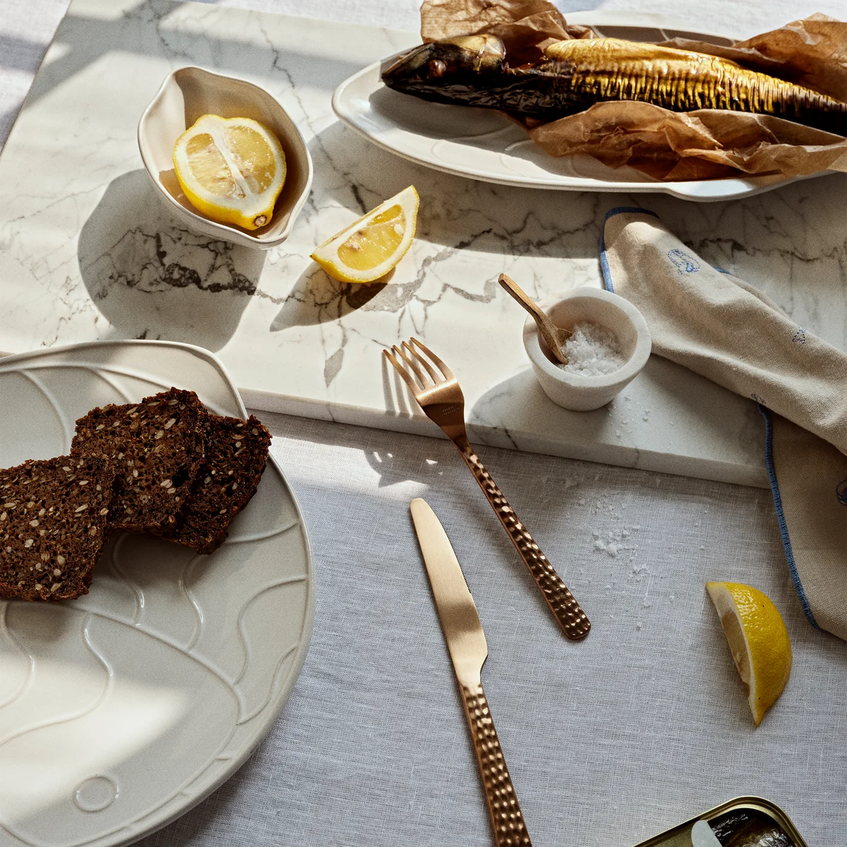 Das Pesce Geschirr von Broste Copenhagen bringt die Meeresluft, das Rauschen und den Geruch des Sommers in den Wohnraum. Handgefertigt aus glasierter Steinware, verfügt das Geschirr über die Silhouette eines Fisches. Mit der abgerundeten Form bringen die Platten eine charmante Note an den gedeckten Esstisch. Die Platten können auch für dekorative Zwecke verwendet werden. Auf dem Esstisch sind sie ideal, um Kekse, Zitronenscheiben oder Desserts zu servieren. Die Pesce Schalen sind in unterschiedlichen Ausführungen erhältlich.