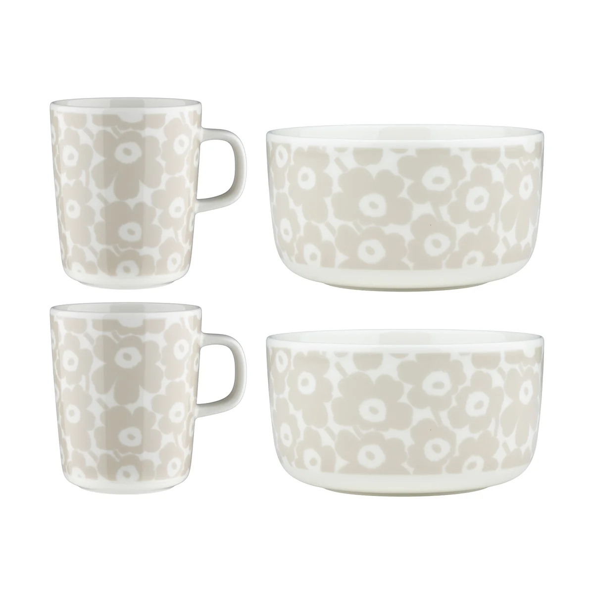 Das Oiva Frühstücksset mit Pikkuinen Unikko Muster von Marimekko kombiniert alltagstaugliche Keramik mit einem der ikonischsten Designs der Marke. Das Set besteht aus zwei Bechern mit Henkel und zwei Schalen. Gefertigt aus weißem Steinzeug, sind alle Teile spülmaschinen-, ofen-, mikrowellen- und gefrierschrankgeeignet – ideal für den täglichen Gebrauch.