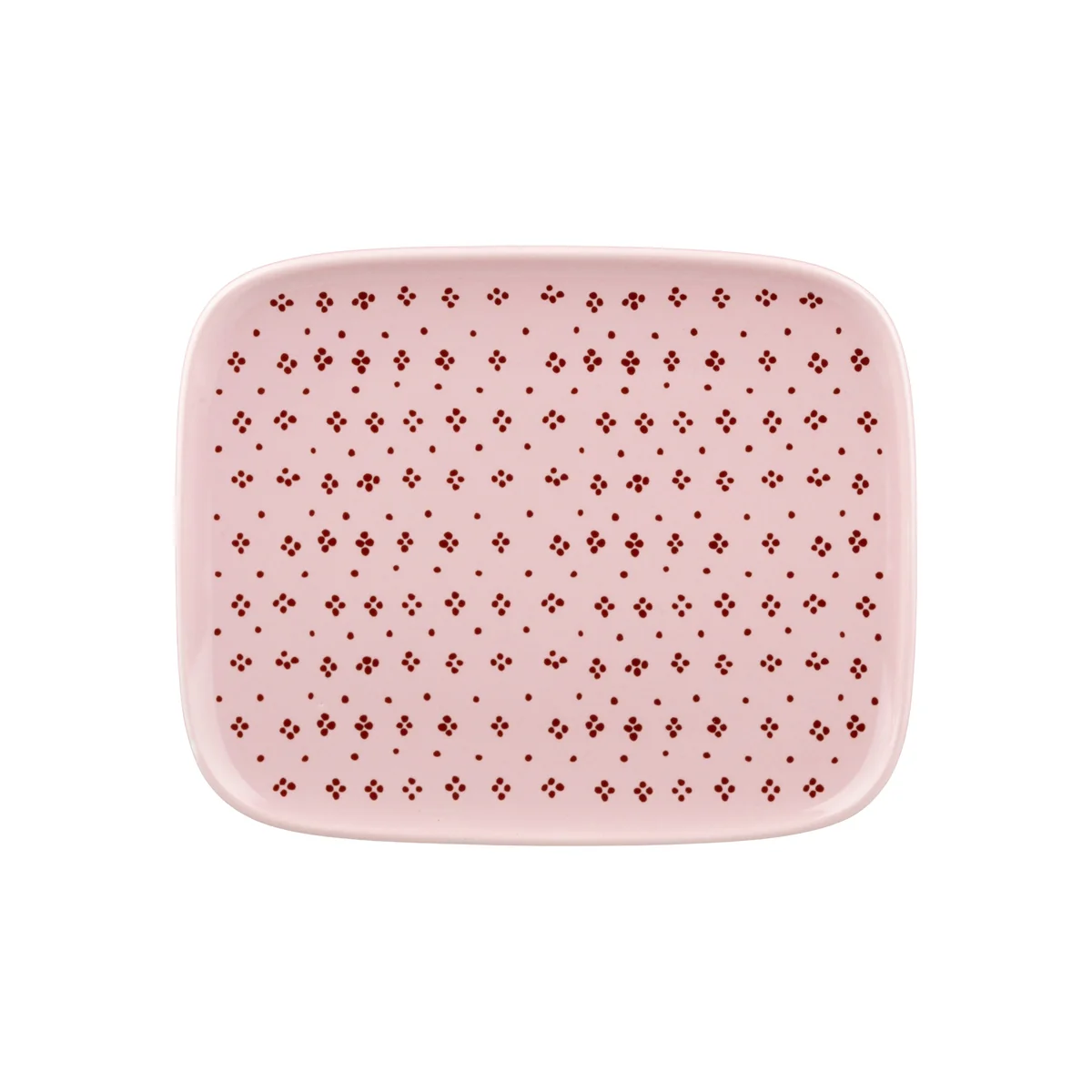 Der rechteckige Oiva Teller mit Muija-Muster besteht aus Keramik mit einer zarten rosa Glasur. Der kleine Teller ist spülmaschinen-, ofen-, mikrowellen- und gefriergeeignet, was ihn sowohl stilvoll als auch praktisch macht.