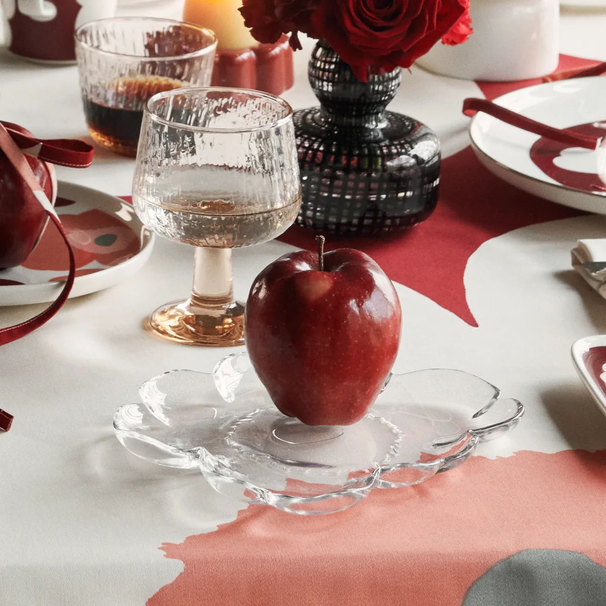 Der blumenförmige Unikko Glasteller von Marimekko. Es empfiehlt sich diesen Teller mit der Hand zu waschen, um sein einzigartiges Design zu erhalten. Er kann zwar in der Spülmaschine gereinigt werden, aber hierbei bitte vorsichtig sein, da das ausgeprägte Design beschädigt werden kann, wenn es mit anderem Geschirr in Berührung kommt.