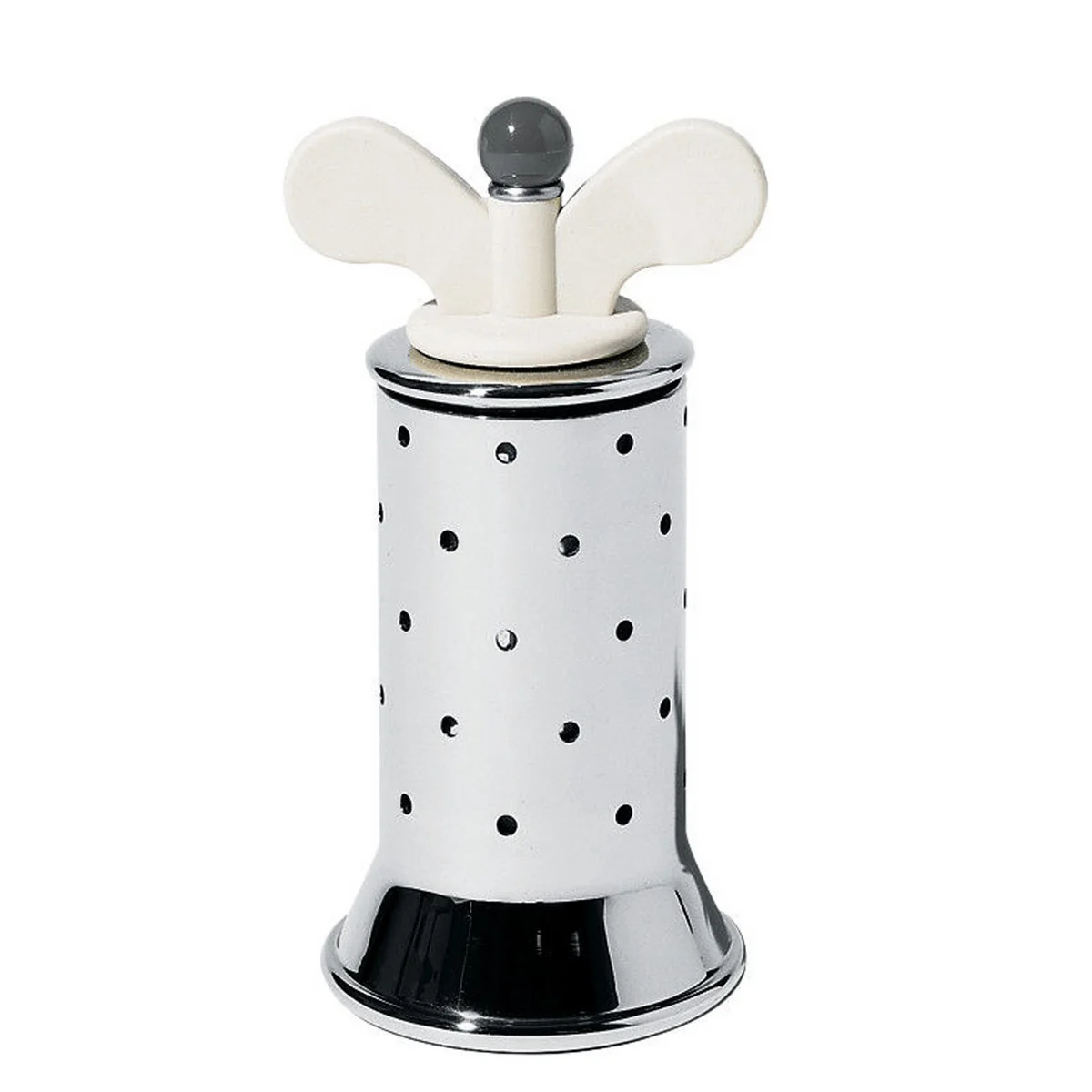 Gleichzeitig ist die 9098 Pfeffermühle aus Edelstahl mit dem übergroßen Flügel aus PA-Kunststoff ein Aushängeschild für die postmodernen Designexperimente, mit denen sich Alessi in den 80er Jahren einen Namen in der Designwelt machte. Das Mahlwerk stammt von Peugeot, sodass auch die Technik im Inneren nicht hinter dem Design zurücksteht.