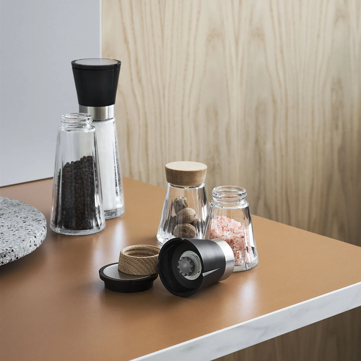 Zum Befüllen wird das Mahlwerk vom Glas abgeschraubt und das gewünschte Gewürz eingefüllt. Die Mühle wird danach auf grobes oder feines Mahlen eingestellt.