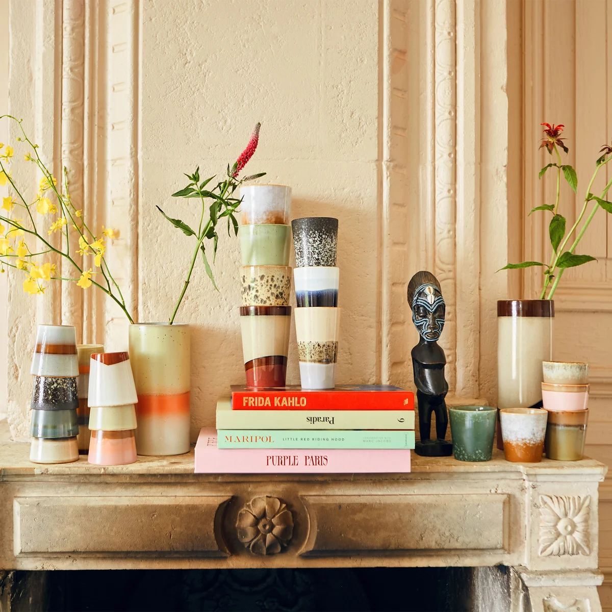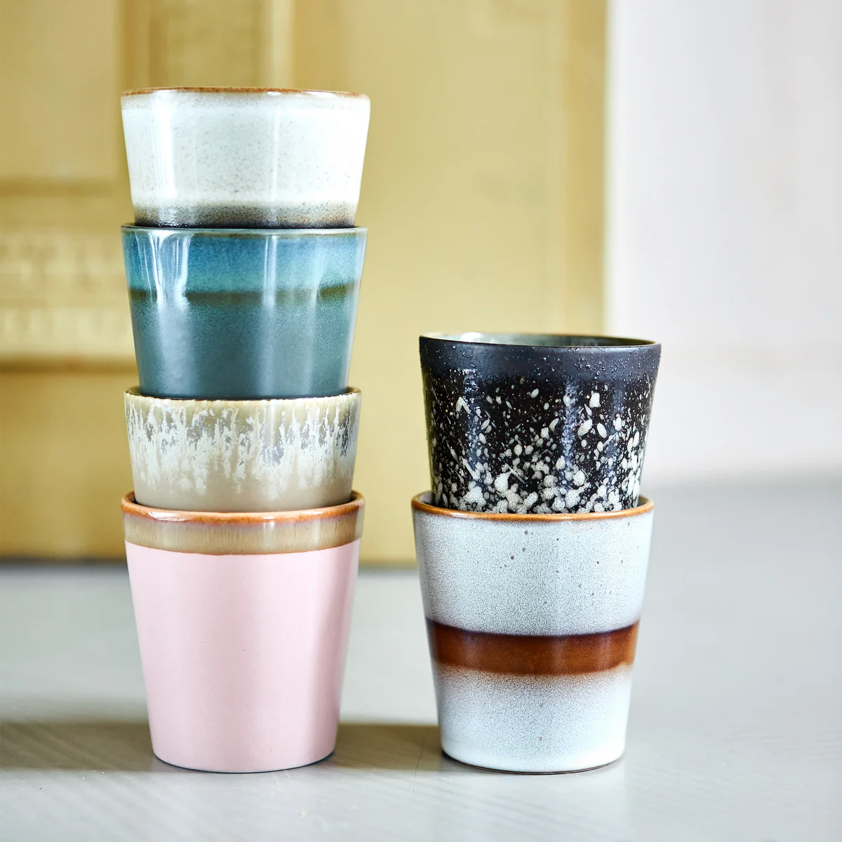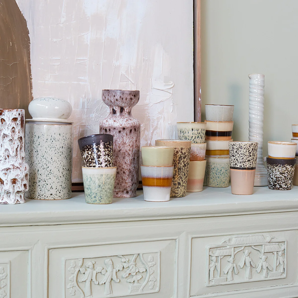 Die 70's Kaffeebecher von HKliving sind für langjährige Sammler wie für Neuentdecker ein Grund zur Freude: Die aus Steinzeug gefertigten Becher sind so einzigartig wie der Fingerabdruck eines Menschen, da sie von Hand gefertigt und glasiert werden. Auf diese Weise entstehen die wunderschönen Muster und Farben, die jeden Esstisch und jeden Geschirrschrank individuell aufwerten.
