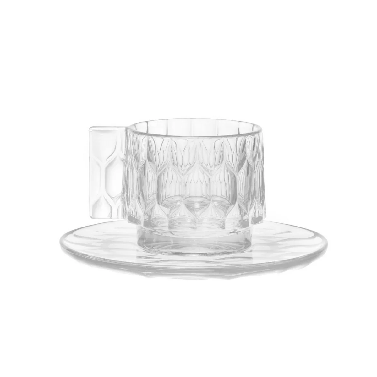 Die Jellies Espresso Tasse von Kartell kommt mit entsprechender Untertasse und begeistert aufgrund ihrer originellen Gestalt. Das transparente oder durchgefärbte PMMA, aus dem das Set gefertigt ist, wurde in eine wabenartige Form gebracht, sodass die Oberfläche fast wie Gelee wirkt. Dieser Effekt sorgt für einen absoluten Blickfang und setzt in verschiedenen Farben besonders auf der klassisch gedeckten Kaffeetafel moderne Akzente.