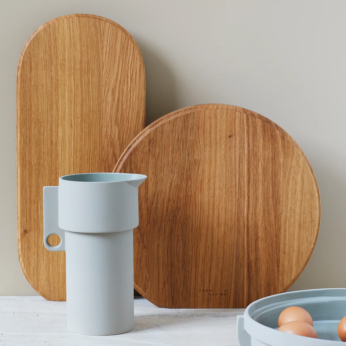 Der Alcoa Krug von Form & Refine ist ein markanter Tonkrug mit einem praktischen Griff, der über eine Öffnung für einen Finger verfügt. Klare Linien im Design lassen ihn auf jedem Esstisch oder in der Küche hervorstechen. Darüber hinaus ergibt sich aus der glänzenden Innenseite und der matten Außenseite ein feiner, raffinierter Kontrast.