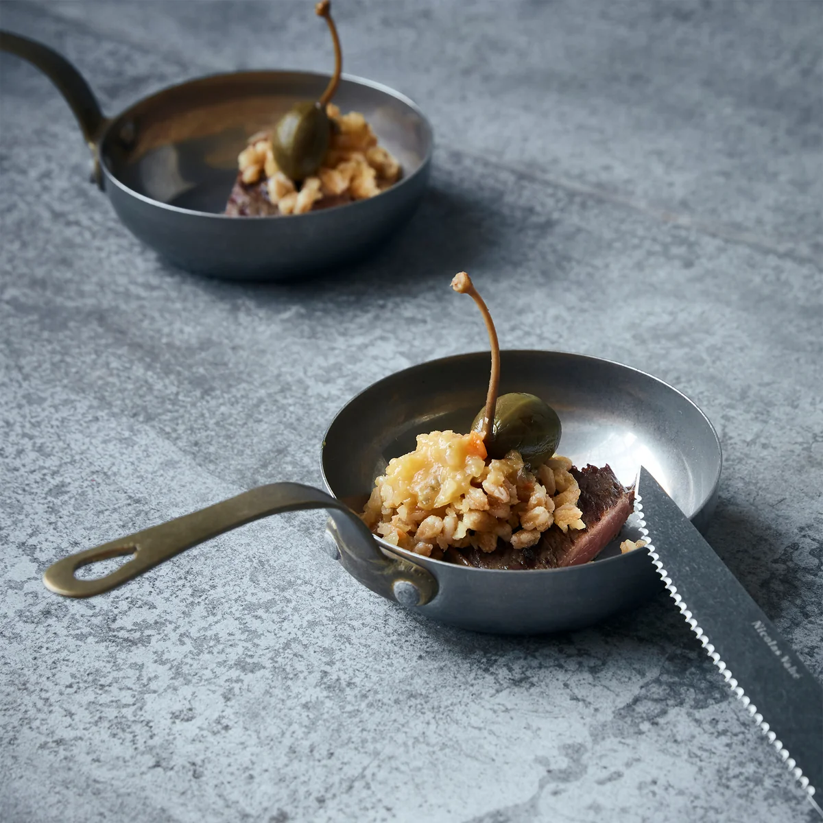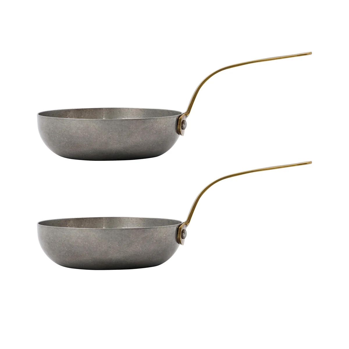 Das Set aus zwei Mini-Pfannen eignet sich zur Präsentation von Omeletts und anderen Gerichten. Diese Pfannen, bekannt als "Presentation", sind konzipiert, um Ihre Kochkünste in Einzelportionen zu servieren. Die Verwendung von Edelstahl und Messing für die Griffe verleiht diesen Pfannen einen rustikalen und dennoch stilvollen Touch. Sie ermöglichen es, Ihre Gerichte direkt aus dem Ofen perfekt angerichtet zu servieren und so Ihren Gästen ein einzigartiges Dinner-Erlebnis zu bieten. Die richtige Präsentation ist ein wichtiger Aspekt eines gelungenen Essens, und mit dieser Mini-Geschirrkollektion von Nicolas Vahé können Sie dies besonders stilvoll umsetzen.