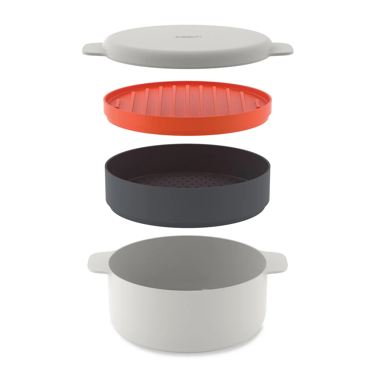 Das Highlight der M-Cuisine Kollektion von Joseph Joseph ist das Mikrowellen-Kochset, welches aus einem 2-Liter-Kochtopf, einem Dampfgarer, einer Bratpfanne/Grillplatte und einem Deckel besteht. Mit diesem Kochset kann ein vollständiges Essen für die ganze Familie zubereitet werden- und das ganz einfach in der Mikrowelle.