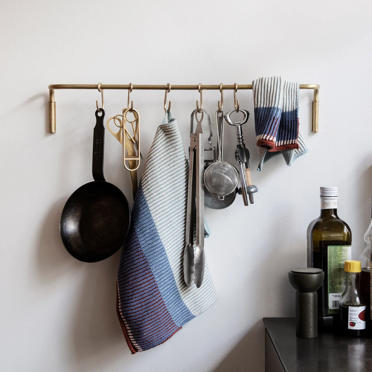 Die Küchenstange von Ferm Living ist eine schöne und einfache Aufbewahrungslösung für Küchenutensilien und Textilien. An der Wand befestigt, nimmt die Stange wenig Platz ein und schafft gleichzeitig viel Platz zum Aufhängen von Geschirrtüchern, Topflappen, Kellen, Zangen, Töpfen, Pfannen und vielem mehr. Auch ein hängender Kräutergarten ist dank der Küchenstange in jeder Küche möglich.