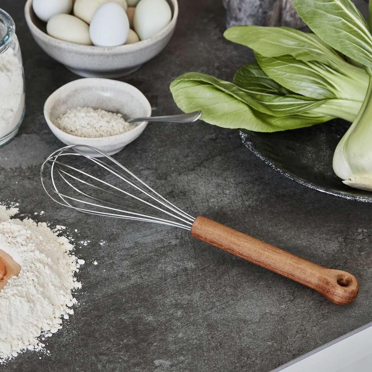 Der Eya Schneebesen verbindet ein stilvolles Design mit praktischer Funktionalität. Mit einem Griff aus hochwertigem Akazienholz und robustem Edelstahl eignet er sich perfekt zum Mischen und Schlagen von Speisen.
