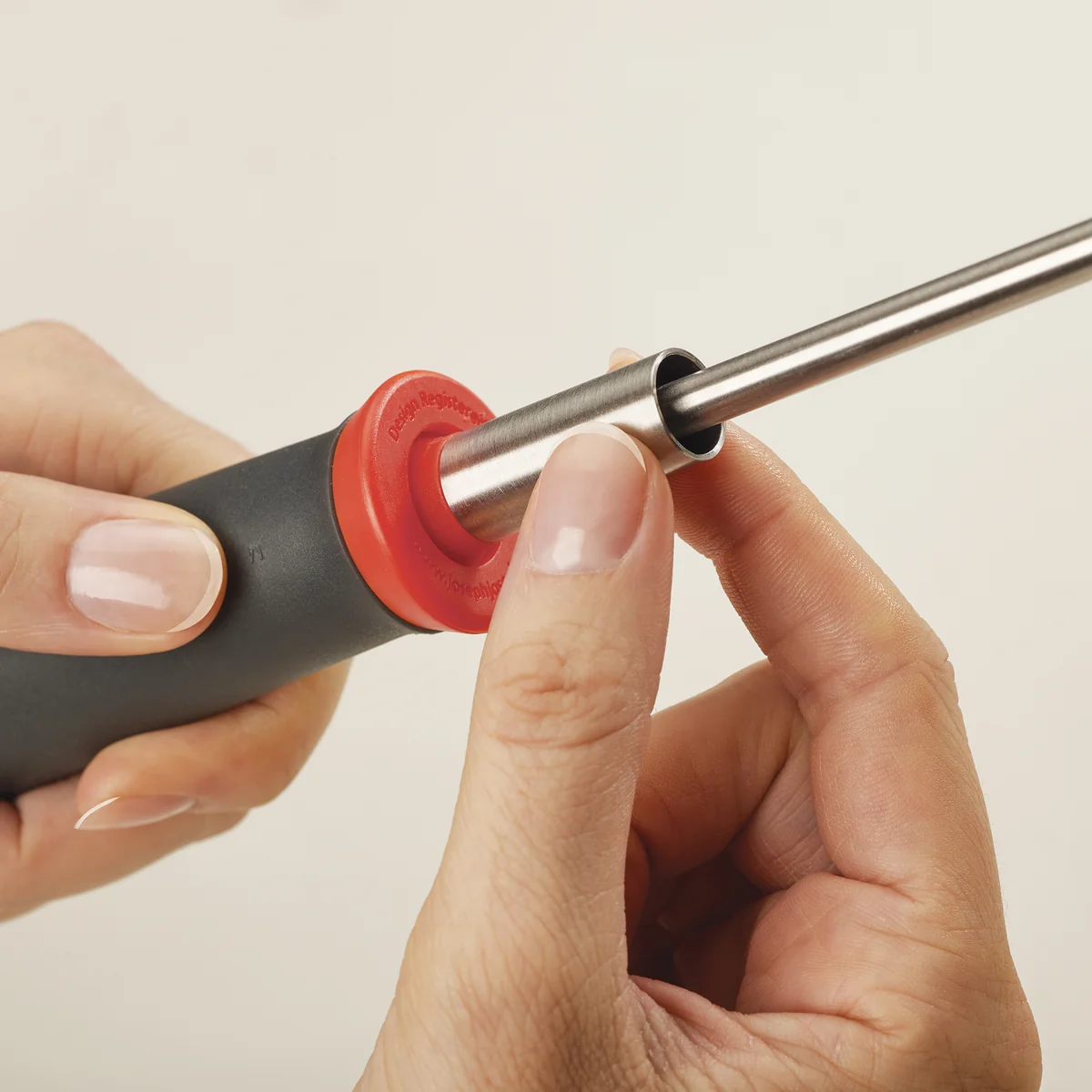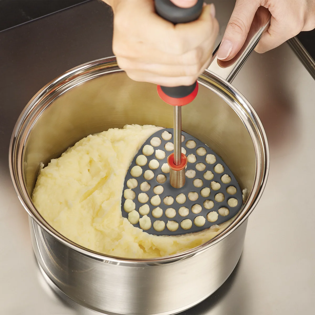 Der Stampfer ist so geformt, dass er sich an die runde Form der Töpfe optimal anpasst um Kartoffeln und Co. leicht zerdrücken zu können. Mithilfe eines kleinen Schieberiegels wird der Stampfer am Griff vertikal verriegelt und wieder gelöst, um den Kopf einfach wegzuklappen.