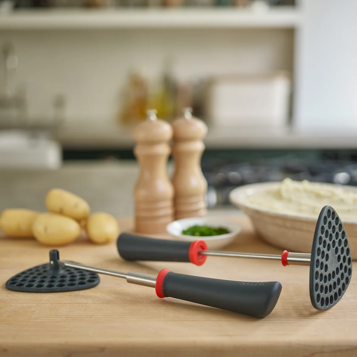 Der Delta Kartoffelstampfer von Joseph Joseph überzeugt mit seinem platzsparenden Design. Der Stampfer verfügt über eine große Stampffläche, die nach Gebrauch umgeklappt wird, damit er in der Küchenschublade oder aufgehängt keinen Platz wegnimmt.