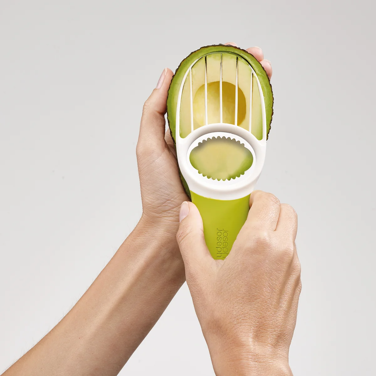 Eine Avocado anzurichten, kann schwierig, aufwendig und manchmal sogar gefährlich sein, wenn man ein scharfes Messer benutzt. GoAvocado von Griffik für Joseph Joseph ist das ultimative Avocado-Tool, mit dem es ein Leichtes ist, die Avocado zu öffnen, den Steinkern zu entfernen und das Fruchtfleisch appetitlich anzurichten.