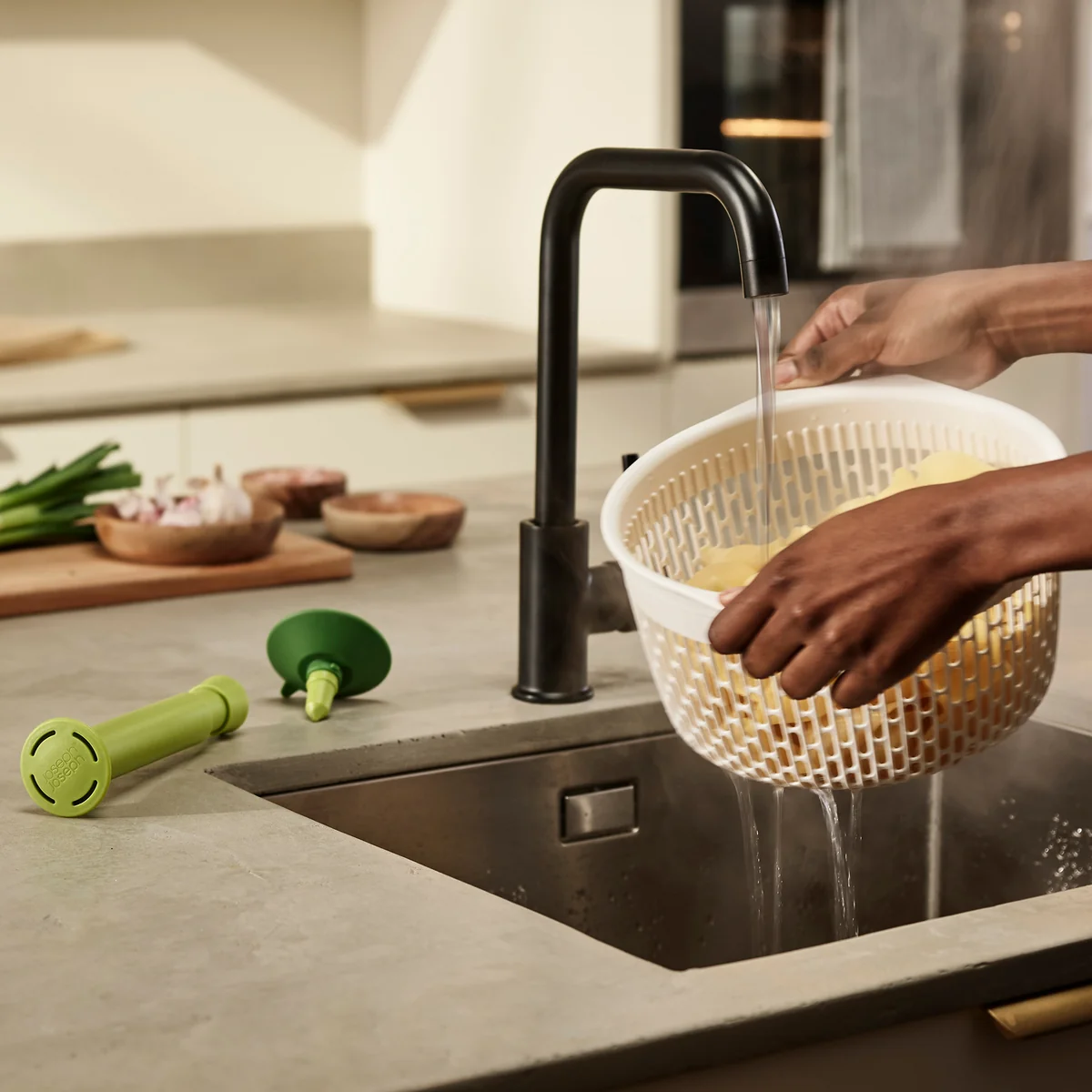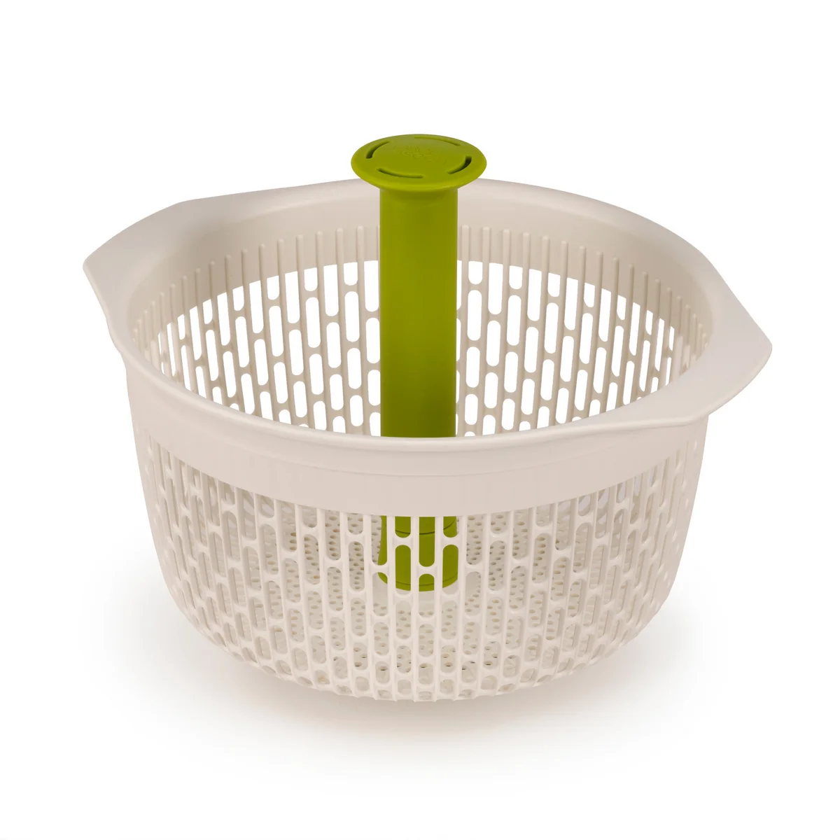 Das Spindola Salat-Schleudersieb für die Spüle von Joseph Joseph begeistert mit seinem innovativen Design. Die Kombination einer Salatschleuder und eines Abtropfsiebs spart auf großartige Weise wertvollen Stauraum. Zur Salatzubereitung werden die Spindel und der Saugnapf ganz simpel am Abtropfsieb befestigt. Der Salat wird hineingegeben und gründlich unter dem Wasserhahn durchgespült. Wird das Abtropfsieb mit dem Saugnapf in der Spüle befestigt, kann die Spindel auf und ab gepumpt werden, um das Sieb zu rotieren und das überschüssige Wasser ablaufen zu lassen. Soll das herkömmliche Abtropfsieb genutzt werden, werden die Spindel und der Saugnapf einfach abmontiert und die seitlichen Griffe kommen zum Einsatz.