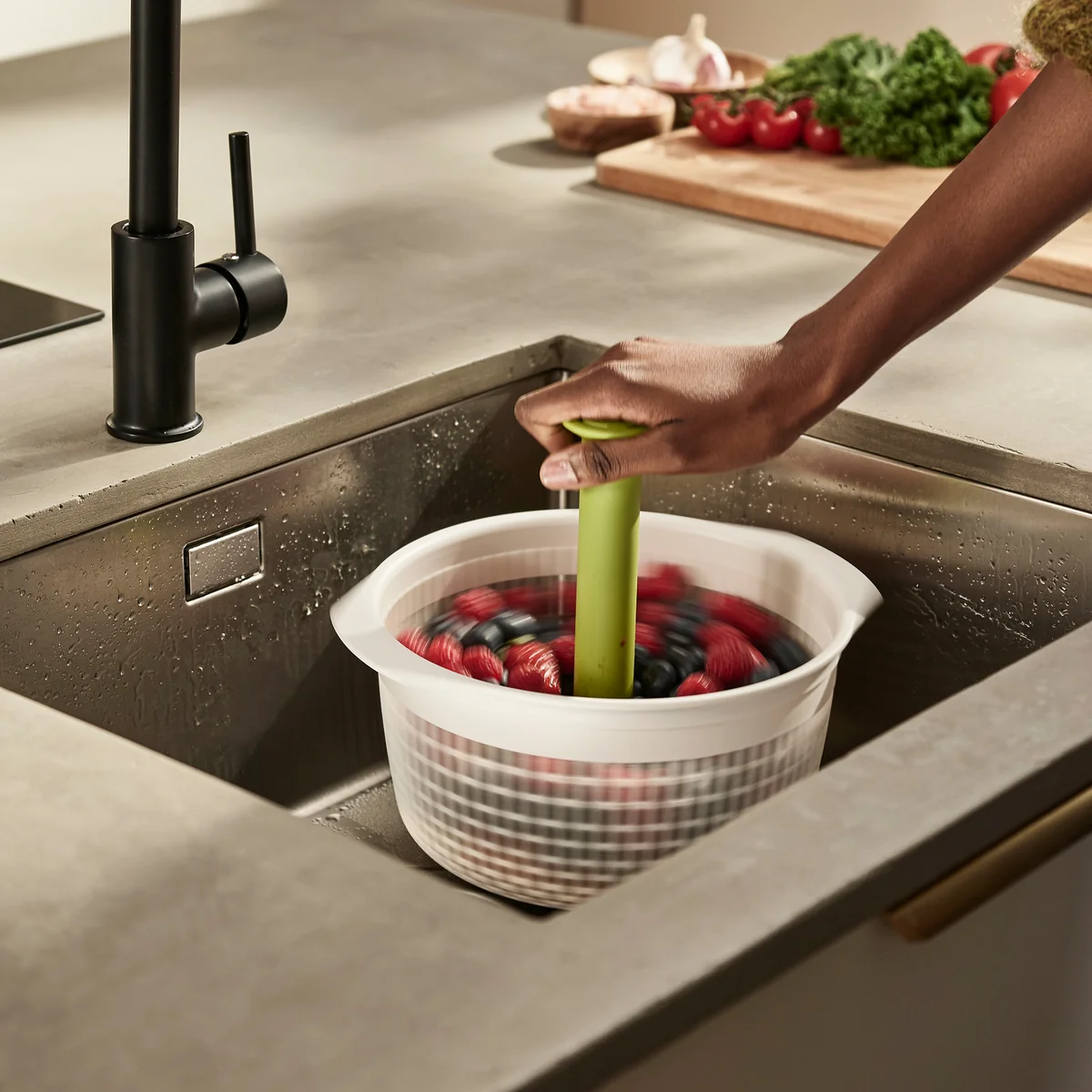 Platzsparendes Salat-Schleudersieb für die Spüle