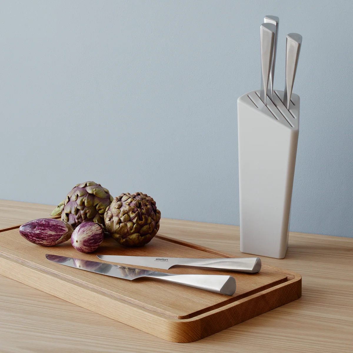 Die dänische Stelton Trigono-Serie besteht aus fünf verschiedenen Messern in deutlicher Geometrie. Gefertigt sind die Messer aus japanischem Stahl, der für Langlebigkeit garantiert. Der eckige Griff liegt gut in großen und kleinen Händen. Entworfen wurden die Messer vom dänischen Architekten Simon Kalmer.