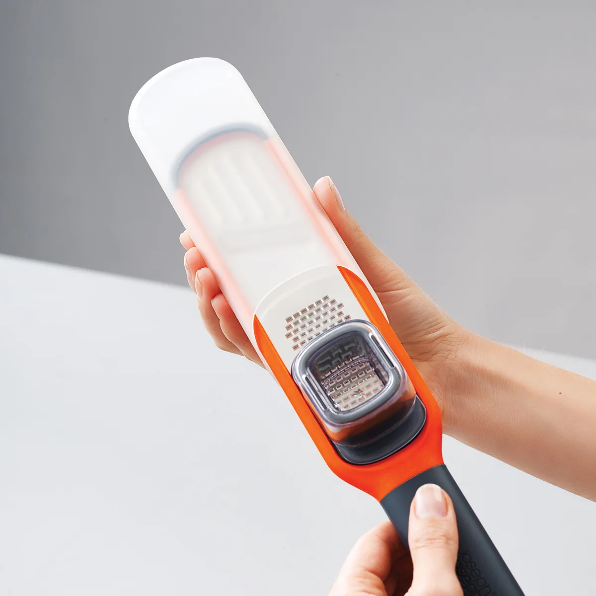Kleinere Lebensmittel zu reiben kann manchmal ein wenig knifflig sein, und wenn man es per Hand macht sind, Fingerverletzungen keine Seltenheit. Um das zu vermeiden, wurde die Handi-Grate 2-in-1 Mini-Reibe und -Hobel von Joseph Joseph entwickelt.