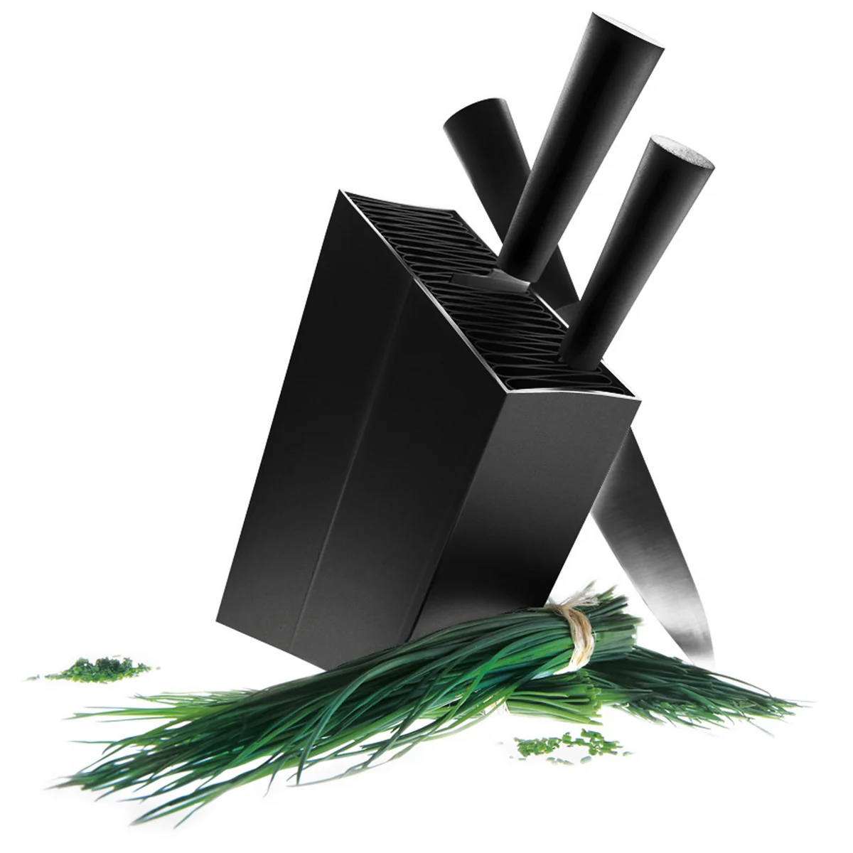 Der Messerblock von Eva Solo wurde von den Designern Claus Jensen und Henrik Holbæk von Tools Design entworfen. In der aus poliertem Aluminium bestehenden Hülle des Messerblocks befindet sich zu Schlangenlinien geformter Kunststoff, in dessen Falten Sie Ihre Küchengeräte - nicht nur die Messer - stecken können. Der Falteinsatz ist herausnehmbar und leicht zu reinigen, was bei herkömmlichen Blöcken oft nicht möglich ist.