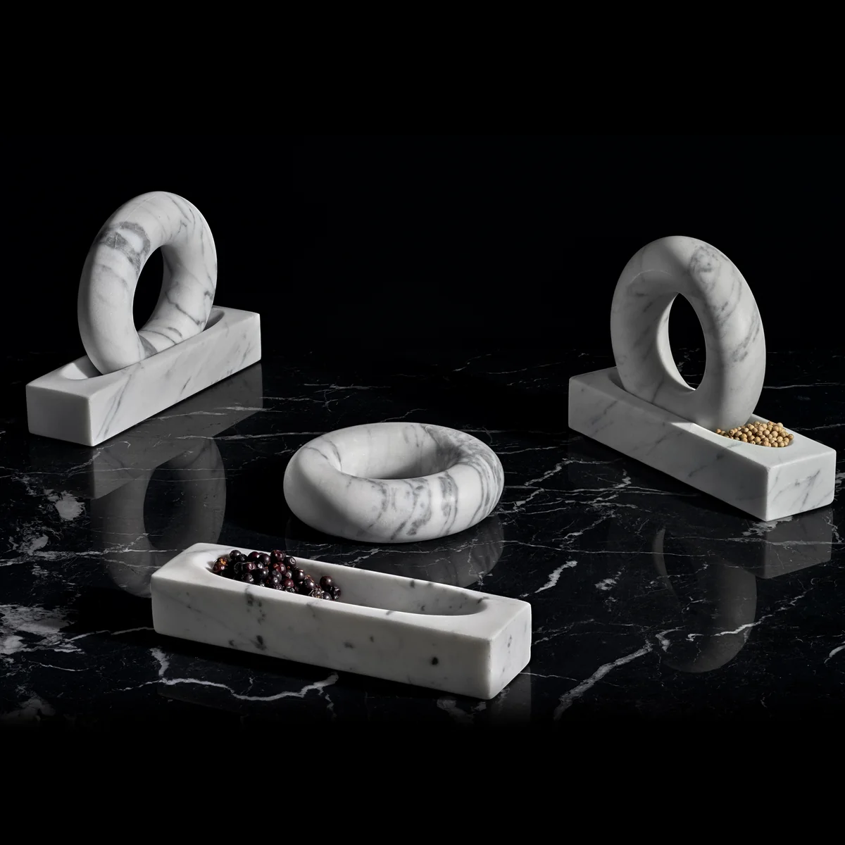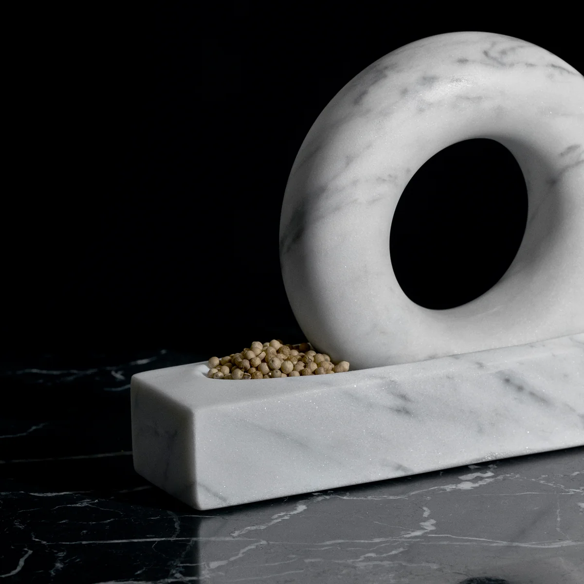 Tondo ist Skulptur und Werkzeug zugleich - völlig einzigartig gestaltet und doch sehr vertraut. Er besteht aus einem Ring und einer Schale mit einer Einkerbung, in die der Ring perfekt passt. Beide Komponenten werden aus massivem und hochwertigem Marmor hergestellt. Pfefferkörner, Gewürze, Salz, Nüsse und vieles mehr werden mit dem Mörser fein zerkleinert. Der Ring liegt dabei optimal in der Hand, sodass das Mahlen zum Vergnügen wird.