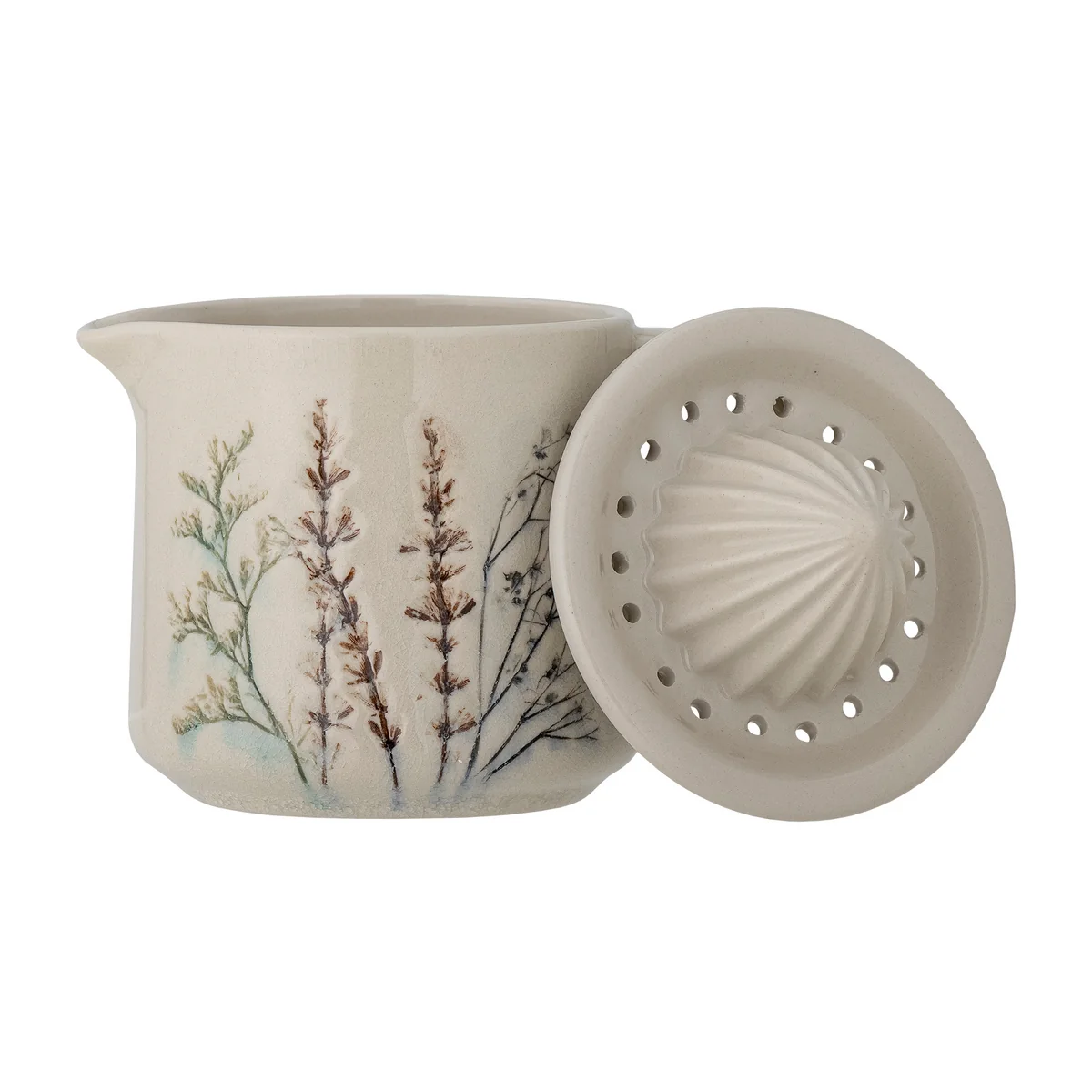 Der Zitronenentsafter von Bloomingville ist eine schöne Saftpresse aus Steinzeug in natürlichen Farben, mit einem zarten Blumenmotiv auf der Glasur. Die Saftpresse ist handgefertigt und daher ist jedes Stück ein Unikat. Spülmaschinenfest.