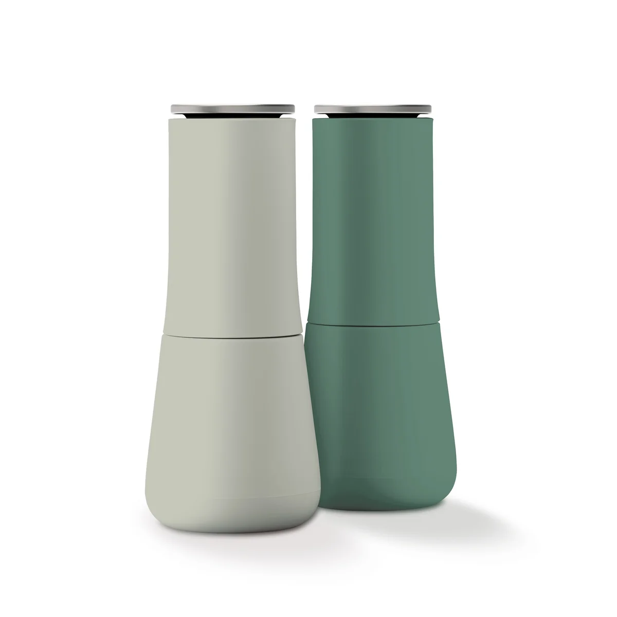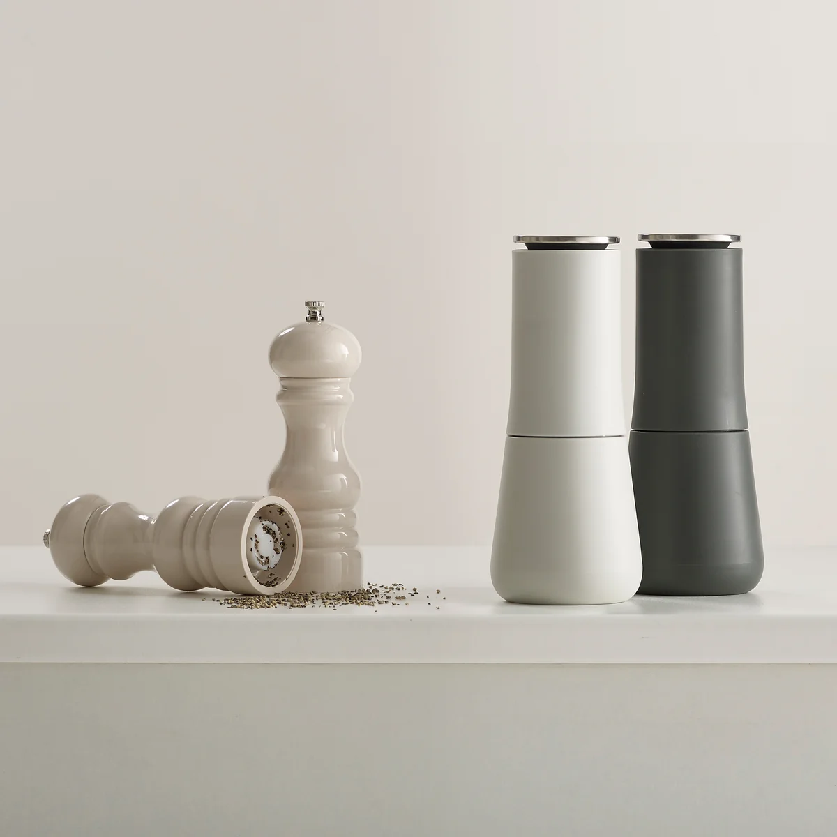Die Mühlen werden aus Kunststoff hergestellt. Das Mahlwerk besteht aus Keramik und die Mühle ist, dank einer großen Öffnung am Boden, leicht zu befüllen. Zum Mahlen dreht man die Mühle einfach um und dreht am Fuß. Die Mahlstärke lässt sich durch Drehen des Edelstahldeckels einstellen.
