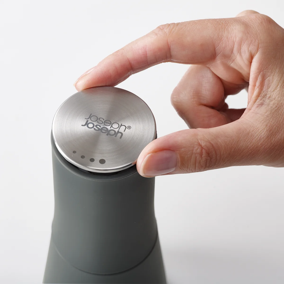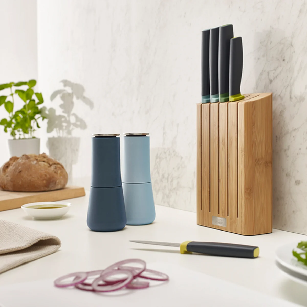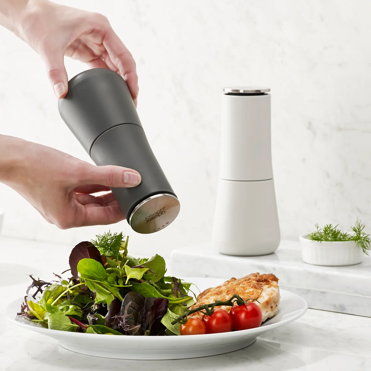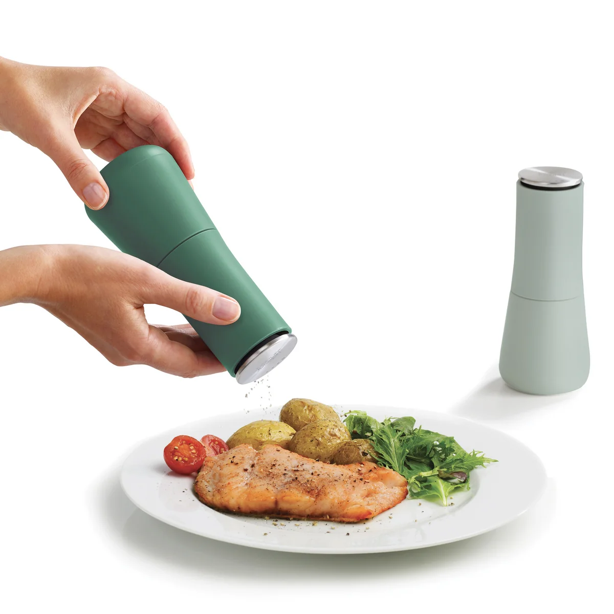 Das Milltop Salz- und Pfeffermühlenset von Joseph Joseph ist innovativ und praktisch. Hinterlassen andere Salz und Pfeffermühlen häufig Reste, wenn sie abgestellt werden, so fällt überschüssig Gemahlenes nach Verwendung zurück in die Milltop Mühlen. Der Trick: Das Mahlwerk befindet sich oben an der Mühle. Das umgekehrte Design verhindert Krümel auf der Arbeitsfläche und dem Esstisch.