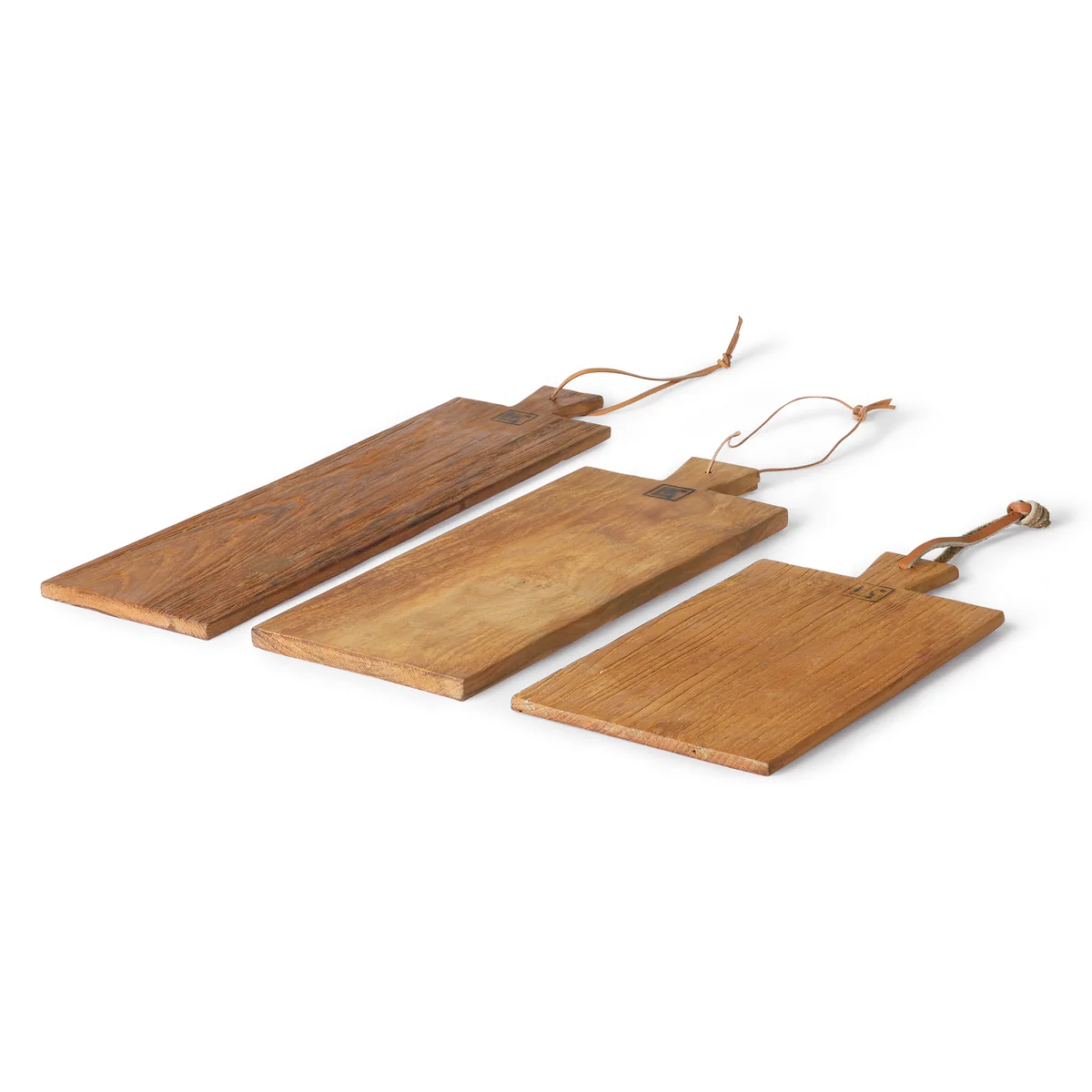 Das Set wird aus Teakholz hergestellt und besteht aus drei verschieden großen Servierbrettern mit einem praktischen Lederband zum Aufhängen.