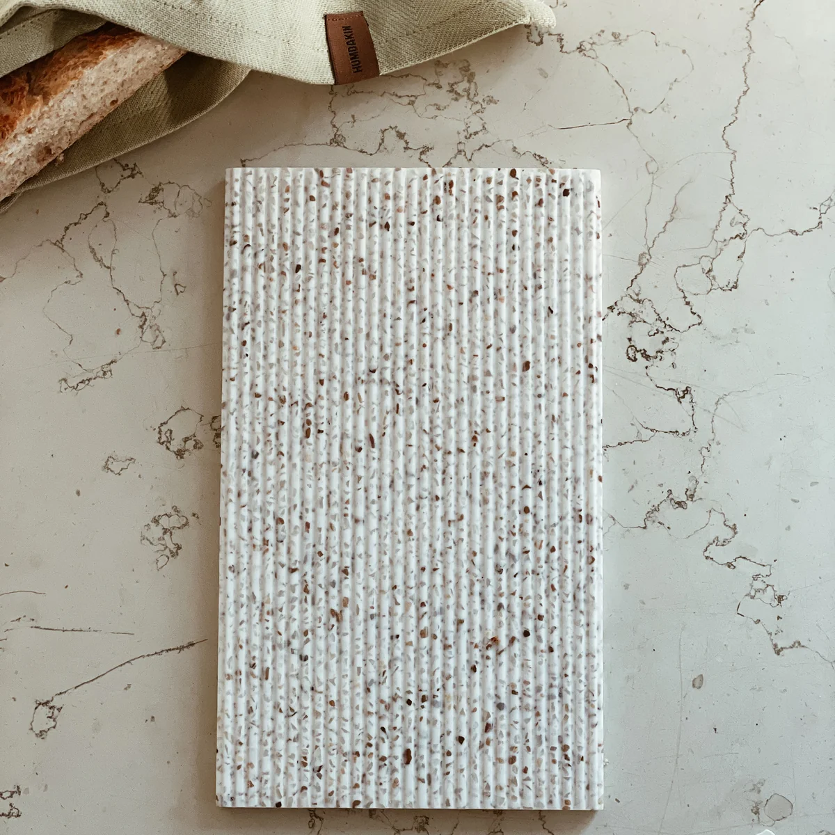 Das Terrazzo Schneidebrett des dänischen Labels Humdakin ist multifunktional einsetzbar. Es kann ideal zur Präsentation von Gewürzen, Speiseölen, Häppchen oder frisch gebackenem Brot verwendet werden. Das geriffelte Schneidebrett fördert die Luftzirkulation, die notwendig ist um Speisen frisch zu halten.