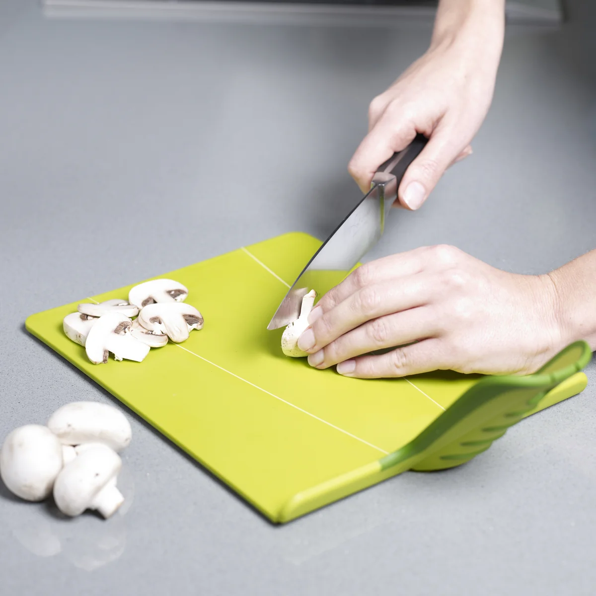 Das Design von Chop2Pot Plus bedient sich der bewährten Technologie der beweglichen Scharniere. Wird der Griff des Schneidebretts zusammengedrückt, klappen die Seiten nach oben und formen so eine Rutsche, die die geschnittenen Lebensmittel oder Abfälle ordentlich dorthin gleiten lässt, wo sie hin sollen.