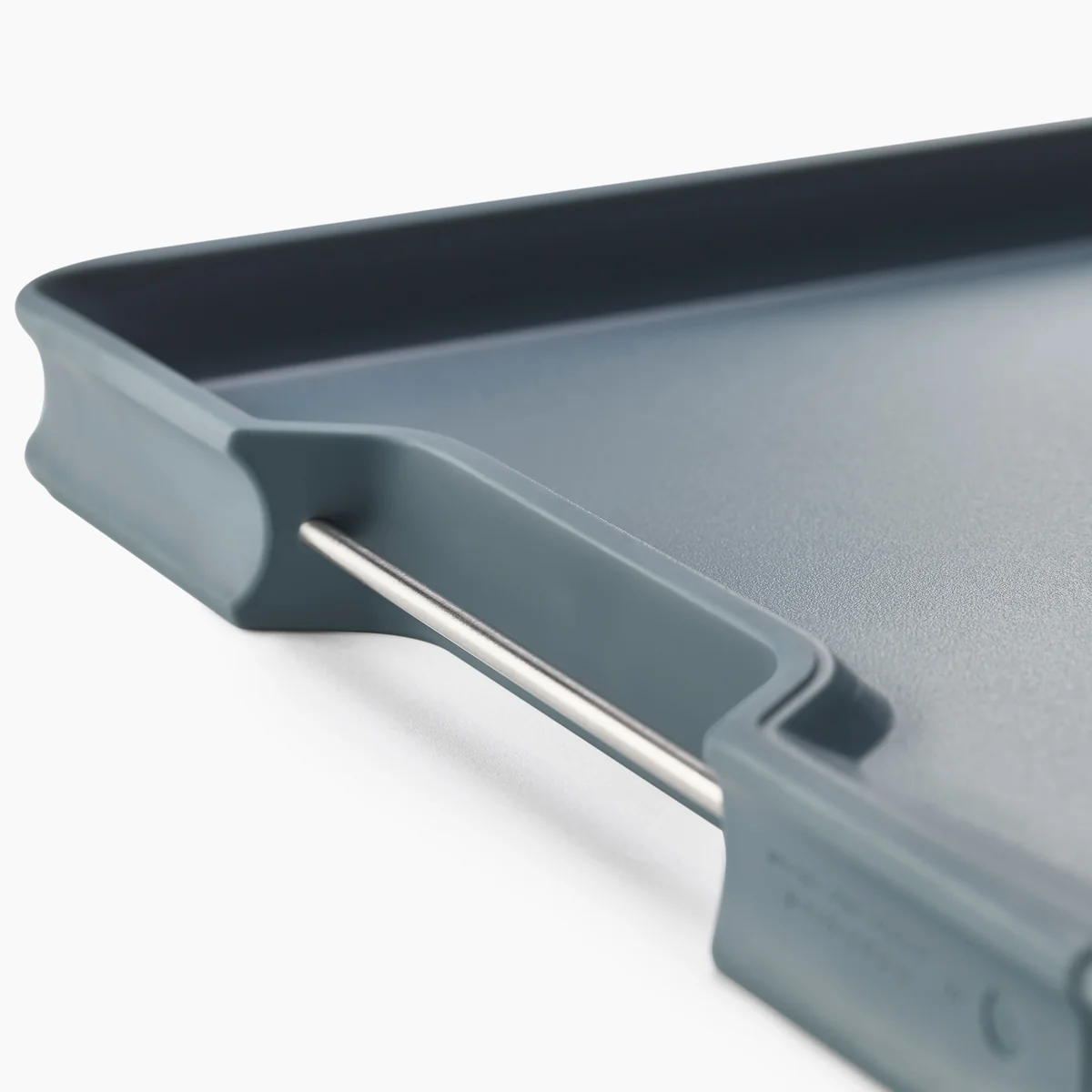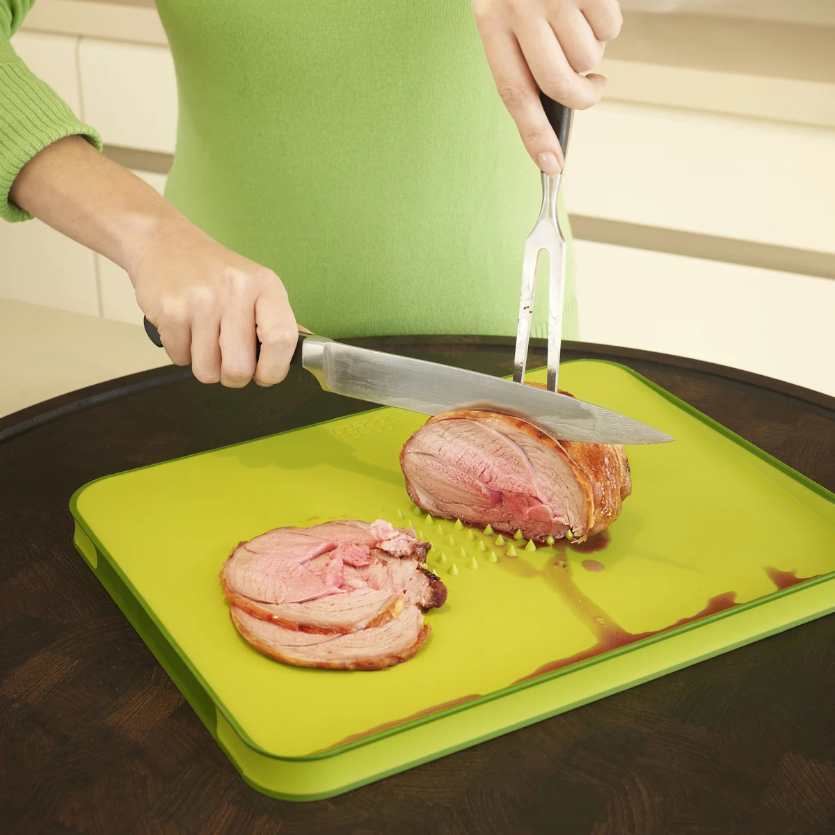 Eine weitere Besonderheit ist die abgewinkelte Schneideoberfläche und der erhöhte Rand des Schneidebrettes Cut & Carve Plus, wodurch sich die entstandenen Flüssigkeiten und Schneidereste leicht sammeln und über die Ecke abgießen lassen. Cut & Carve Plus besitzt außerdem eine Umrandung aus Silikon, die das Wegrutschen verhindert und für sicheren halt sorgt.