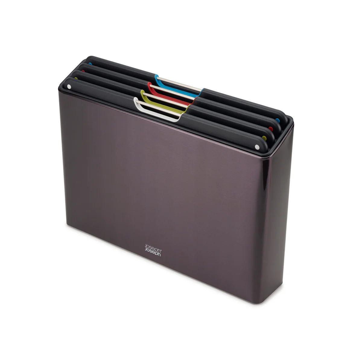Die Folio Steel Schneidebretter von Joseph Joseph helfen dabei Ordnung in der Küche zu halten. Vier unterschiedlich farbige Schneidebretter werden in einem schmalen Edelstahl-Gehäuse aufbewahrt und können durch einen Griff einfach entnommen werden.